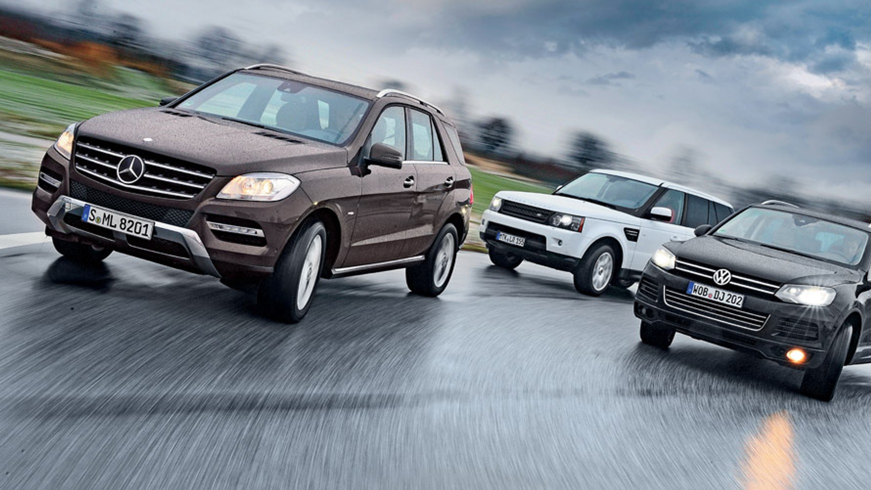 W kwestii komfortu VW jest trochę za Mercedesem, ponieważ nie wychwytuje krótkich nierówności tak wprawnie jak ML. Mimo wszystko jest samochodem z komfortowo zestrojonym zawieszeniem. Czy testowane limuzyny ktoś kupuje z myślą o jeździe w terenie? Jeśli ktoś taki jednak się zdarzy z pewnością ominie salon VW, przynajmniej jeśli chodzi o wersję o mocy 204 KM, w której nie ma możliwości domówienia reduktora i blokad dyferencjałów. W Mercedesie możemy dokupić właśnie taki zestaw (wraz z elektroniką dopasowującą działanie podzespołów do nawierzchni). Absolutnym hitem terenowym będzie Range Rover Sport – ma ramę, w standardzie znajdziemy też pneumatyczne zawieszenie i reduktor. To auto rzeczywiście terenu się nie boi.