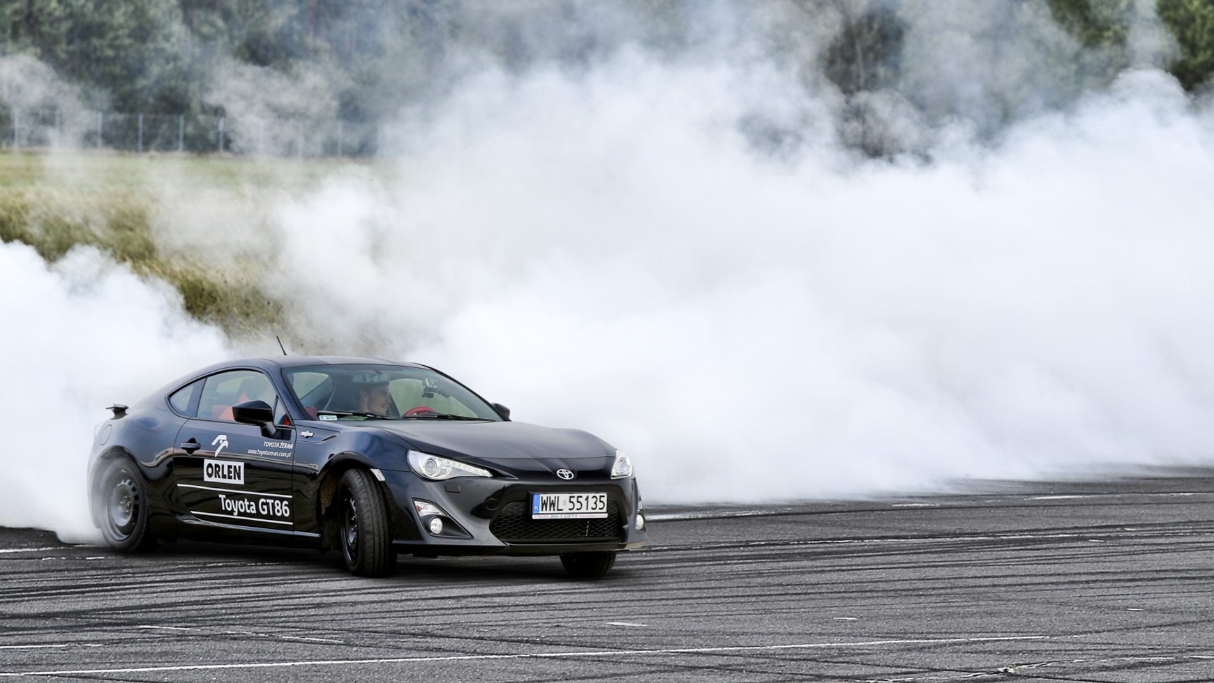 Pierwsze lody między Kubą a jego podopiecznymi zostały błyskawicznie przełamane. W jednej chwili możesz z nim porozmawiać jak z dobrym kumplem o Toyocie Suprze (marzy, by mieć taką w garażu, tak samo jak ty), żeby za moment dowiedzieć się z pierwszej ręki, jak to jest stracić orientację na trasie Dakaru. I wcale nie ma się wrażenia, że Kuba uważa się za bohatera. Pozostało już tylko oswoić się z przedmiotem szkoleniowym – 200-konną Toyotą GT86. Seryjny sprzęt, który pozwala łatwo się okiełznać nawet niezbyt doświadczonym kierowcom. Ma wszystko, czego potrzeba, żeby móc stawiać pierwsze kroki w drifcie bądź szlifować nabyte już umiejętności: napęd na tył, dyferencjał ze szperą, nisko umieszczony środek ciężkości, komunikatywny układ kierowniczy, mechaniczny hamulec ręczny i całkowicie wyłączalne ESP. Szkoda czasu na długą teorię, Kuba po kolei zapraszał więc młodych adeptów driftu na prawy fotel i w zwięzły sposób opisywał, co należy zrobić z samochodem, żeby zarzucił tyłem tuż za słupkiem, a nie na barierce.