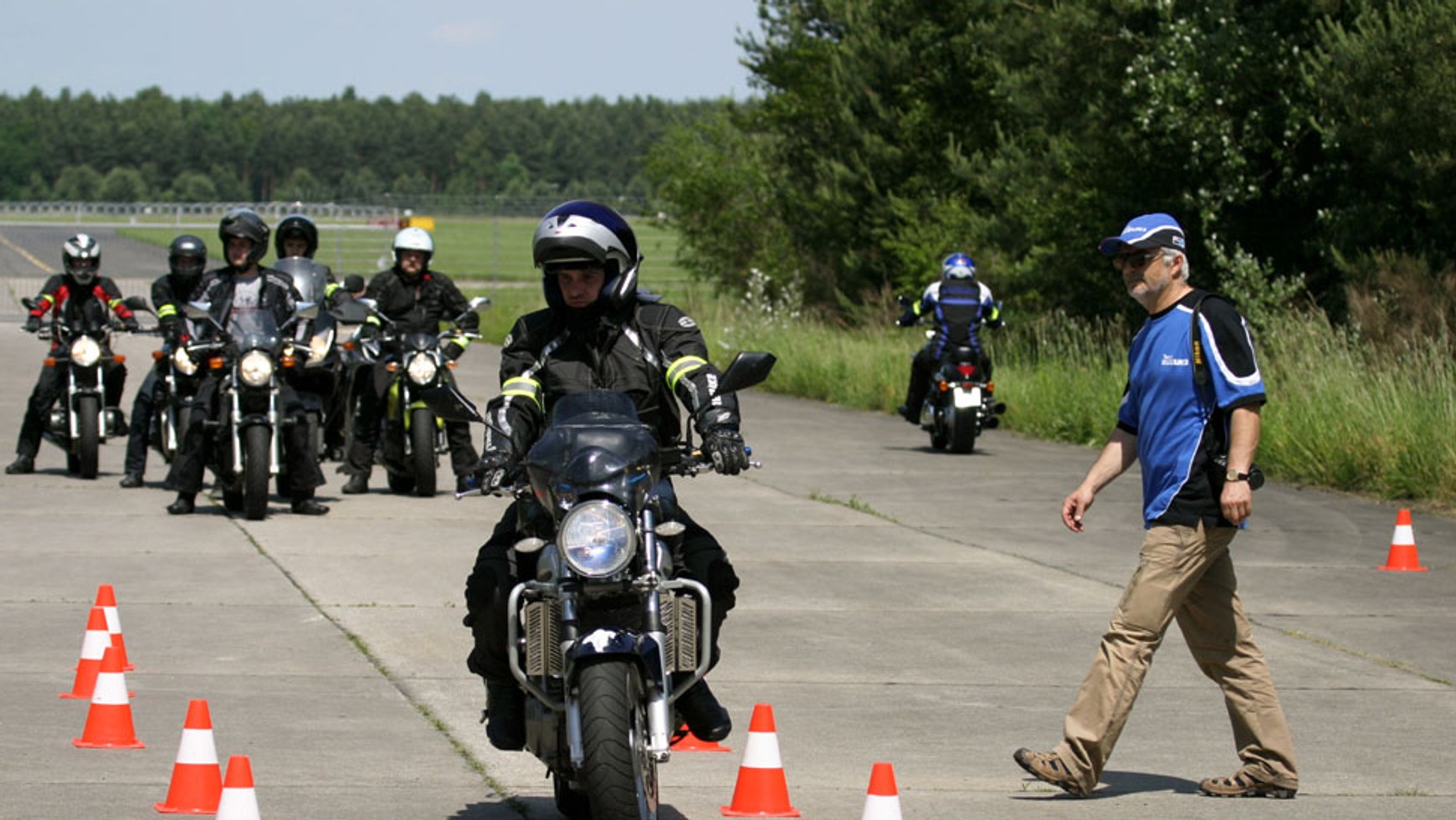Po blisko godzinnym wykładzie uczestnicy przenoszą się na plac manewrowy, gdzie każdy z nich na własnym motocyklu wykonuje ćwiczenia praktyczne pod okiem instruktorów. Na początek dobrze znaną każdemu „ósemkę”, jednak z próbą skupienia wzroku na punkcie będącym środkiem zakreślanego okręgu. Jak się okazuje, bywa to dość trudne. Kolejne ćwiczenia (jazda po okręgu, wolna jazda po łuku, szybka jazda po łuku, awaryjne hamowanie na prostej i na zakręcie oraz technika przeciwskrętu) pozwalają nawet doświadczonym motocyklistom uświadomić to, że zawsze można się czegoś nowego nauczyć, a pełne panowanie nad maszyną wymaga często znajomości technik, do których samodzielnie bardzo trudno dojść.