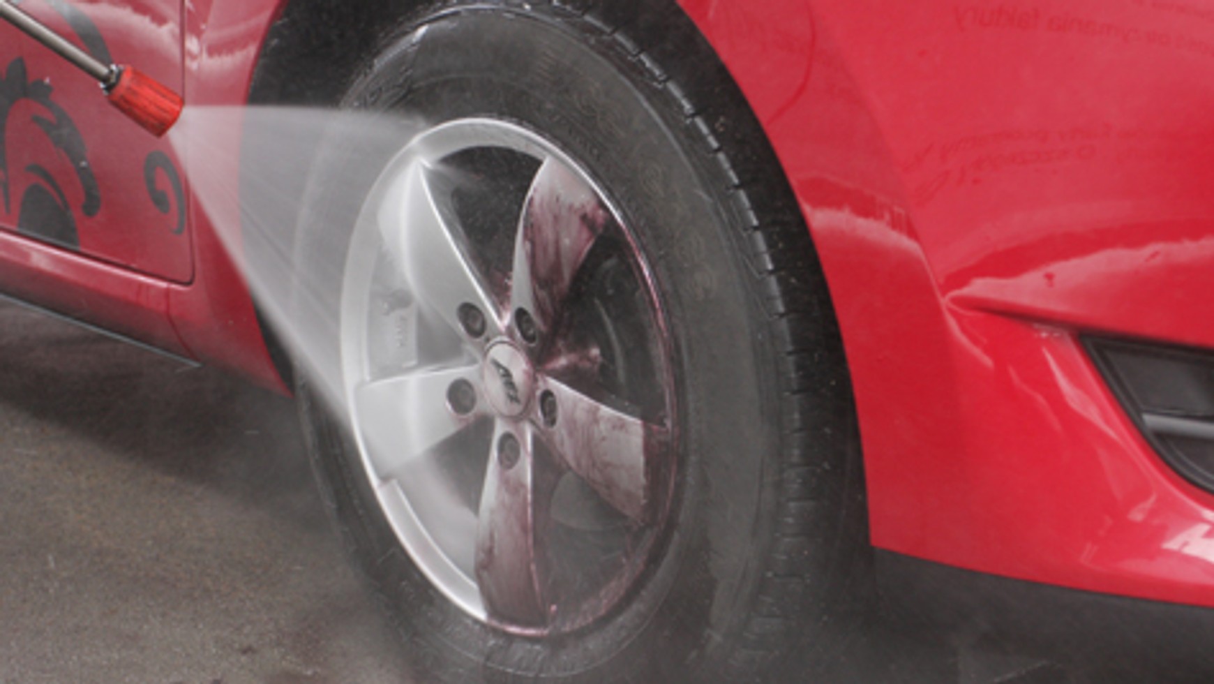Spłukujemy brud, najlepiej myjką ciśnieniową. Pamiętajmy, że brud spływający z kół może pobrudzić kostkę brukową, zatem najlepiej to robić w myjni. Jeżeli nie mamy myjki, możemy płukać koła wodą z wiadra.