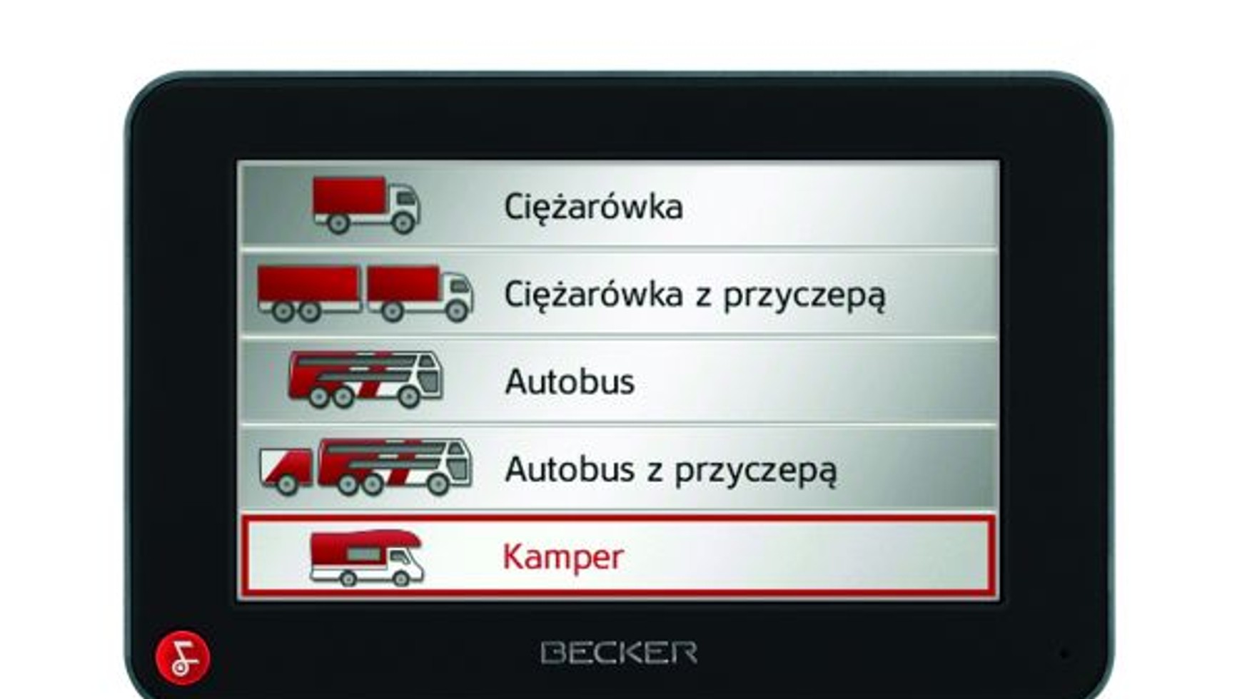 Marka Becker prezentuje nowe urządzenie dopasowane do potrzeb kierowców samochodów ciężarowych, autobusów, samochodów kempingowych oraz samochodów z przyczepami. Oprócz wyboru profilu pojazdu, specjalna aplikacja pozwala na wprowadzenie jego dokładnych danych: wymiarów pojazdu (długość, szerokość, wysokość), obecności przyczepy, liczby osi, aktualnego tonażu oraz posiadania materiałów niebezpiecznych (4 kategorie). Dzięki temu z obliczania trasy zostają wykluczone nieprzejezdne drogi dla danego pojazdu: tunele, mosty, drogi z ograniczeniem tonażu lub zakaz wjazdu z niebezpiecznymi materiałami (ADR). Dodatkowo producent zainstalował specjalną bazę punktów POI dla samochodów ciężarowych np. stacje benzynowe, parkingi lub warsztaty.