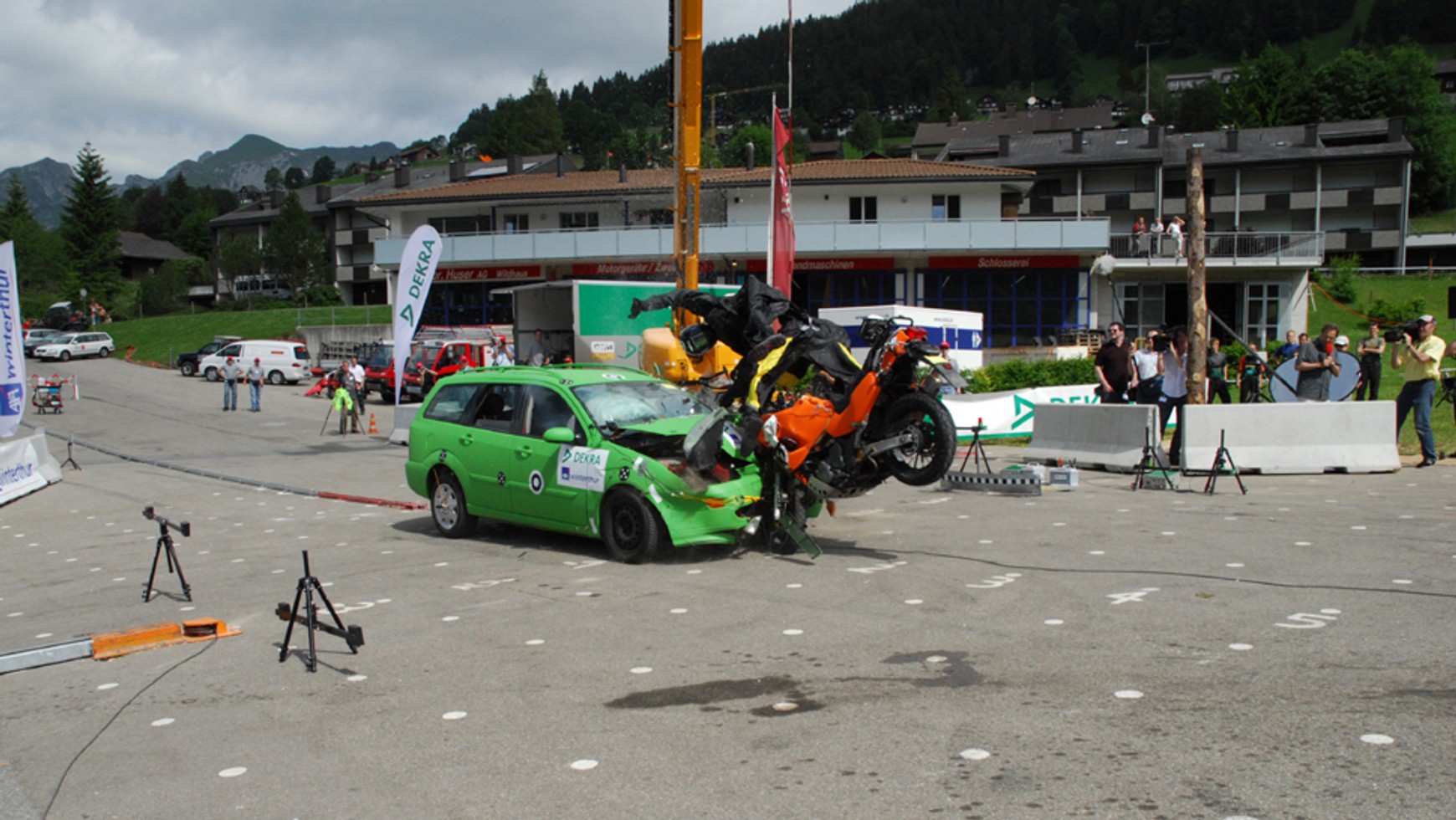 1. Rozpędzone do prędkości ok. 80 km/h auto bez hamowania wjeżdża pod kilkutonową przyczepę rolniczą. Brak ochronnych barier powoduje, że pojazd wbija się pod przyczepę.