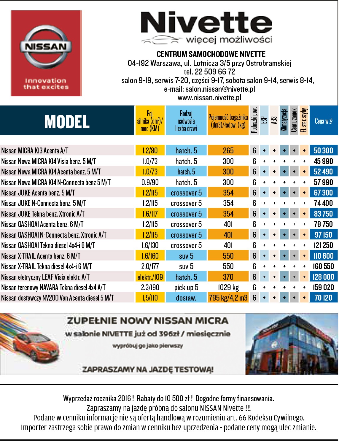 Nissan - Centrum samochodowe Nivette 30 maja 2017, 20:04 Skróć artykuł Wyprzedaż rocznika 2016! Rabaty do 10 500 zł! Dogodne formy finansowania. Zapraszamy na jazdę próbną do salonu Nissan Nivette!!! Podane w cenniku informacje nie są ofertą handlową w rozumieniu art. 66 Kodeksu Cywilnego. Auto Świat nissan nivett