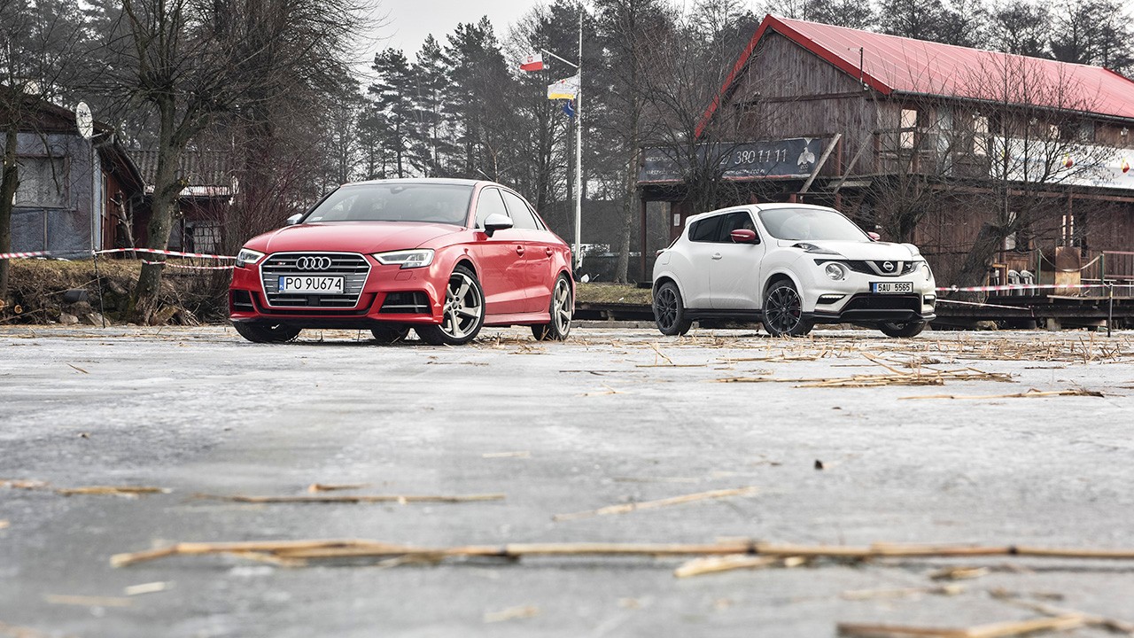 Wyjazd na Mazury zaplanowaliśmy z Szymonem o godzinie 6.00 rano. Ja zabrałem Nissana Juke Nismo RS, a naczelny Audi S3 Limousine z poprawionym napędem quattro. Choć to zupełnie dwa różne samochody i w żadnym stopniu nie zamierzaliśmy ich porównywać, to już działanie samego napędu 4x4 w lodowych warunkach jak najbardziej.