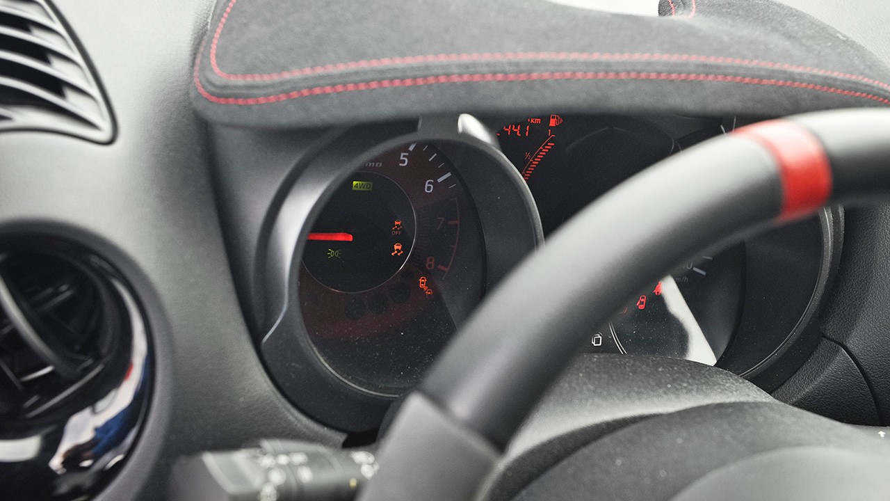 W Nissanie Juke Nismo RS poprzecznie ułożony silnik sprzężony jest ze skrzynią biegów (w naszym wypadku CVT), która przekazuje stale napęd na przednią oś. Tryb pracy napędu można jednak zmienić za pośrednictwem sprytnie ukrytego i niepodświetlonego przycisku po lewej stronie kierownicy. Kiedy już go znajdziemy, możemy przełączyć na tryb TVS (system wektorowania momentu obrotowego, który przekazuje moc na poszczególne koła indywidualnie) lub stały napęd 4x4. Tak to wygląda w teorii. A jak wypada w praktyce? O tym już za moment.