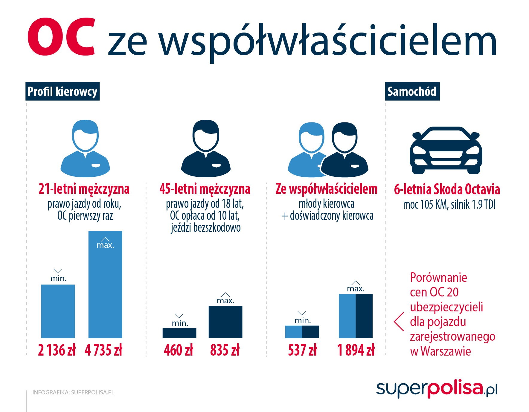 Ile da się w ten sposób zaoszczędzić? Przyjmując, że pierwszym właścicielem skody octavii będzie 45-letni kierowca z powyższego przykładu, a współwłaścicielem zostanie jego 21-letni syn bez historii ubezpieczeniowej, okaże się, że wspólnymi siłami uda im się kupić OC nawet za 537 zł. To czterokrotnie mniej niż w przypadku pierwszego ubezpieczenia kupowanego przez młodego kierowcę na własną rękę. W najgorszym razie polisa kosztowałaby ich 1850 zł, a więc i tak o kilkaset złotych mniej niż najtańsze OC dla 21-latka.