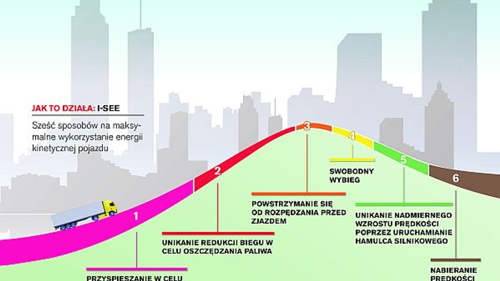 "I-See jest jak autopilot połączony z tempomatem samochodu ciężarowego, który na wzniesieniach przejmuje kontrolę nad skrzynią biegów, silnikiem i hamulcami, zarządzając nimi tak, by osiągnąć jak najniższe zużycie paliwa. I-See do maksimum wykorzystuje funkcję wolnego koła - a więc na niektórych odcinkach drogi zużycie paliwa jest zerowe - wyjaśnia Hayder Wokil, menedżer produktu w Volvo Trucks.