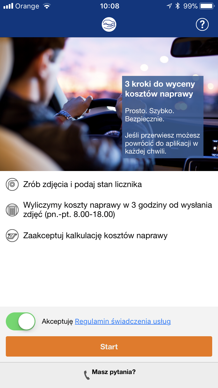Aplikacja jest łatwa w obsłudze. Nie trzeba przechodzić żadnej żmudnej konfiguracji, ponieważ Aplikację tak zaprojektowano, aby jej obsługa była możliwie jak najbardziej intuicyjna. Nawet początkujący użytkownik bez problemu sobie z nią poradzi – także w stresującej sytuacji jaką jest uczestnictwo w kolizji.