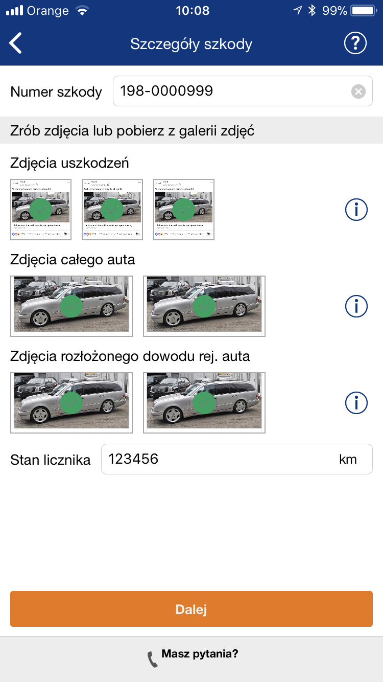 Fotografujemy jednak nie tylko samochód, ale również dowód rejestracyjny – z obu stron. Wpisujemy jeszcze stan licznika i gotowe. Wszystko wysyłamy bezpośrednio z aplikacji do likwidatora szkody.