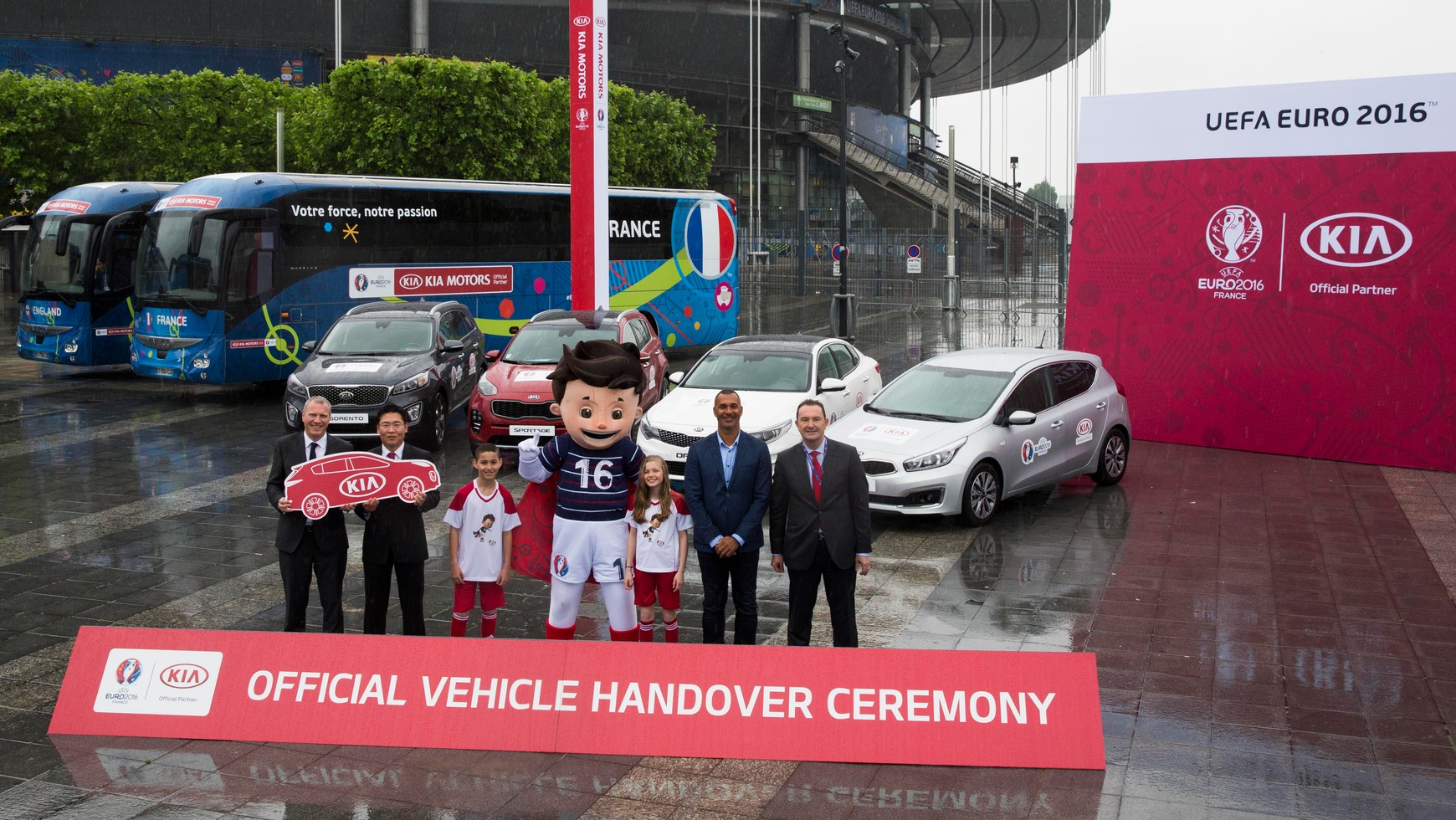 Południowokoreański producent jest oficjalnym dostawcą samochodów na cele transportowe narodowych drużyn piłkarskich, zespołów sędziowskich, działaczy, delegatow UEFA oraz zaproszonych gości VIP. Wśród 447 przekazanych pojazdów znalazły się takie modele jak: Sportage, Optima, Sorento, Carens, cee’d oraz Soul. Cała akcja ma na celu zwiększenie rozpoznawalności marki Kia na scenie europejskiej – także poprzez liczne reklamy w czasie eventów UEFA EURO 2016 oraz bilbordy podczas eliminacyjnych i mistrzowskich meczów piłkarskich.