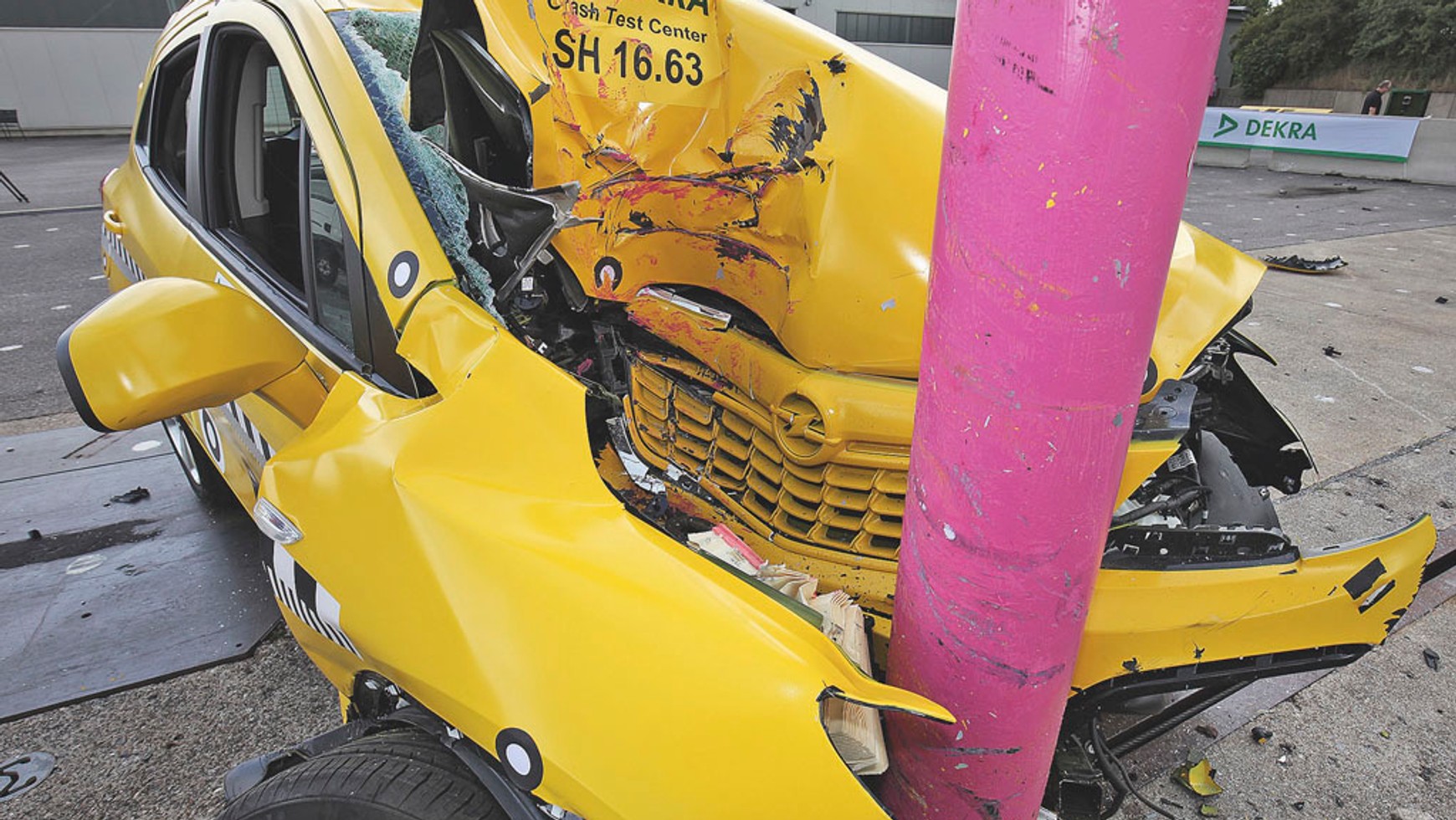 Żeby test był jak najbardziej zbliżony do sytuacji, która mogłaby się wydarzyć w normalnym ruchu, auto zostało rozpędzone do 80 km/h, a słup wycelowano w prawą część przodu Opla. Wewnątrz pojazdu umieszczono dwa manekiny (każdy kosztuje ok. pół miliona zł), wyposażone w liczne czujniki mierzące przeciążenia podczas kolizji.