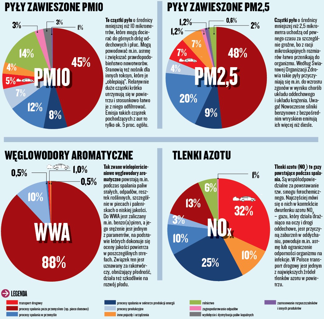 Uwaga! Poniższe wykresy, pochodzące z najnowszego raportu NIK-u o ochronie powietrza przed zanieczyszczeniami, zawierają dane w skali całego kraju. W aglomeracjach miejskich z dużym natężeniem ruchu udział procentowy poszczególnych źródeł zanieczyszczeń może być zupełnie inny. To oczywiste, że jeśli stacja pomiarowa znajduje się tuż przy głównej arterii drogowej, to większość rejestrowanych przez nią zanieczyszczeń pochodzi z przejeżdżających samochodów.