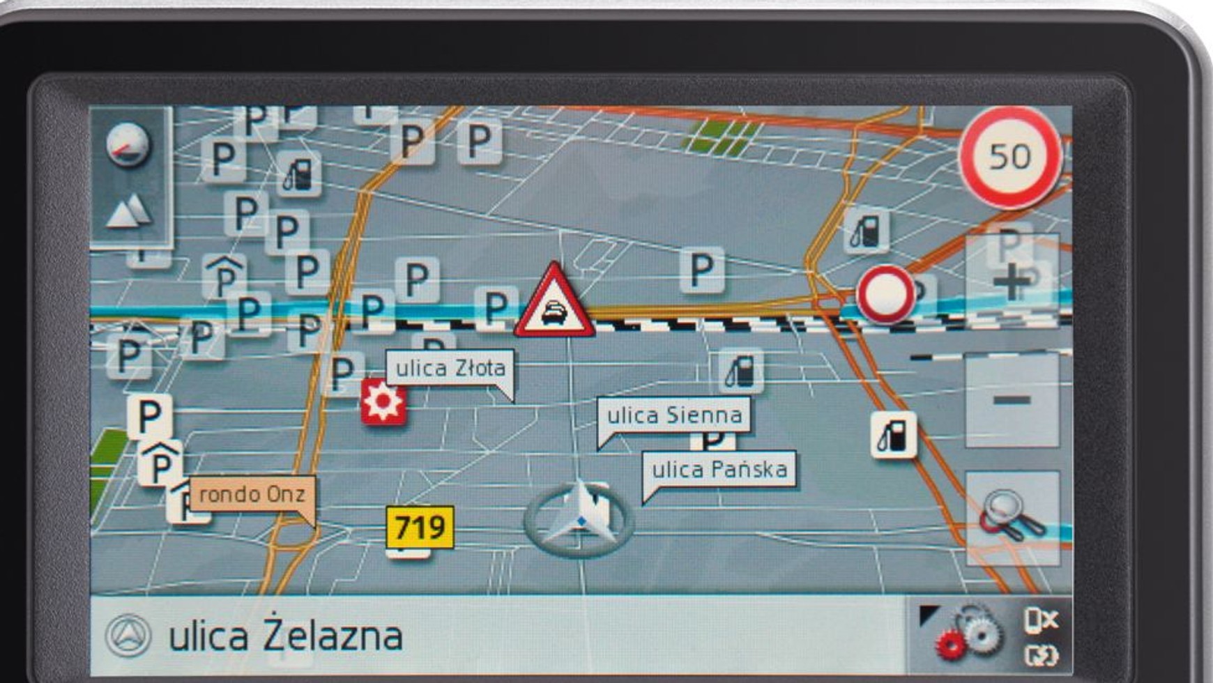 System pokazuje utrudnienia w ruchu z podziałem na rodzaje (korki, wypadki, roboty drogowe, zwężenia ulic), a kierowca jest automatycznie informowany o zdarzeniach na wyznaczonej trasie.