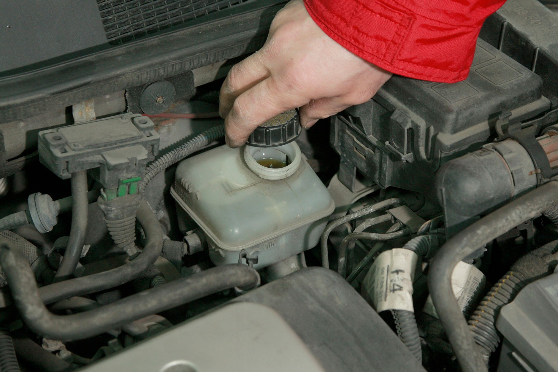 Jeśli na desce rozdzielczej zapali się kontrolka niskiego stanu płynu hamulcowego, to czasem po prostu wynika to ze zużycia klocków i tarcz. Tłoczek zbyt daleko wysuwa się wtedy z zacisku, zostawiając więcej miejsca na płyn. Jeżeli jednak gdziekolwiek sączy się płyn hamulcowy, trzeba działać natychmiast – to potencjalnie śmiertelnie niebezpieczna usterka. Płyn hamulcowy może też wyciekać z hydraulicznego wysprzęglika!