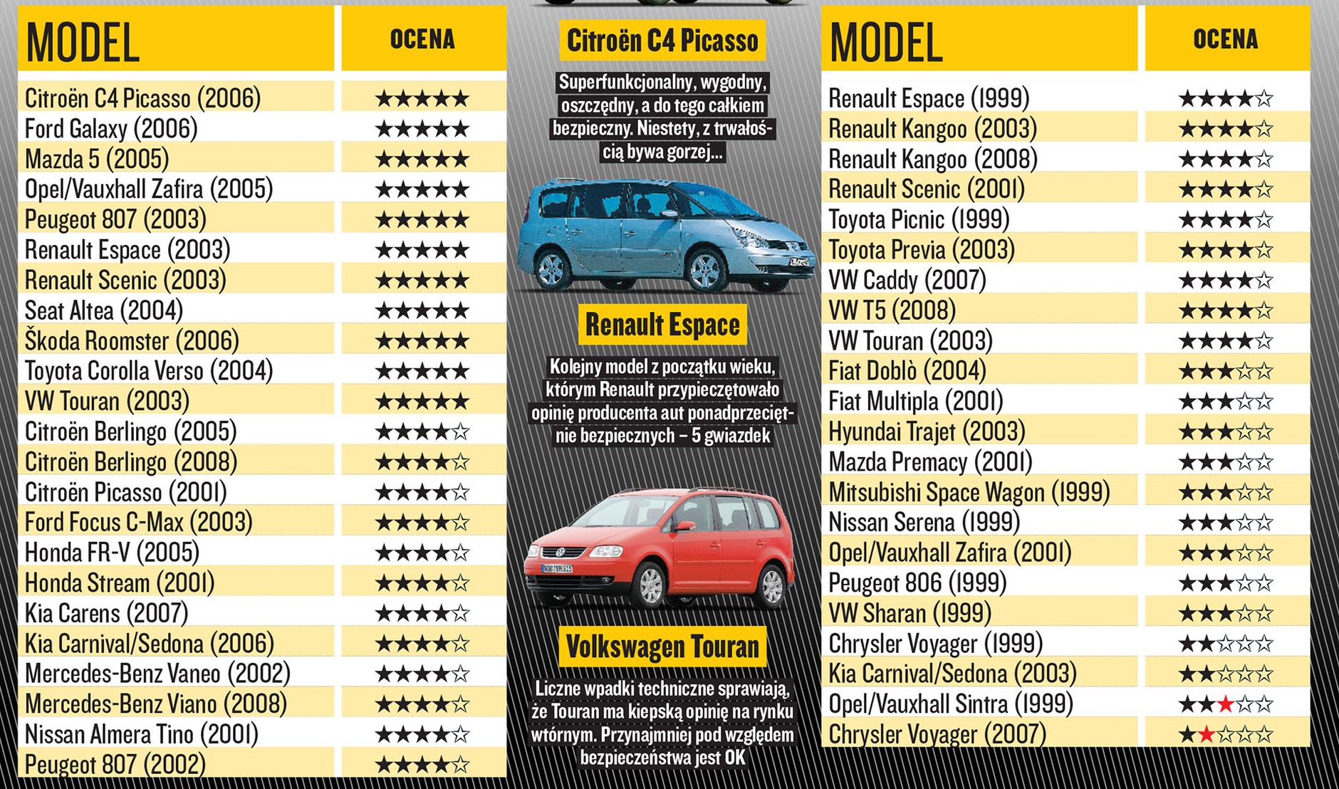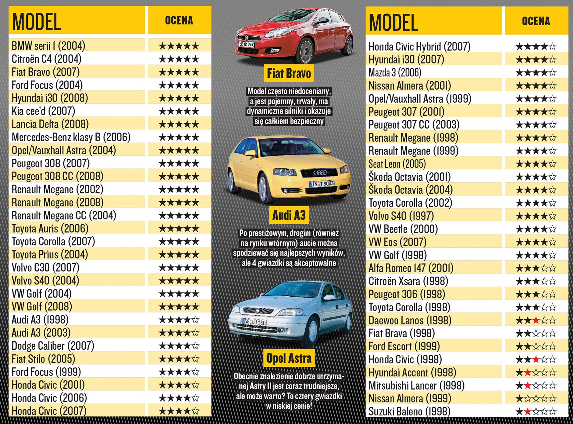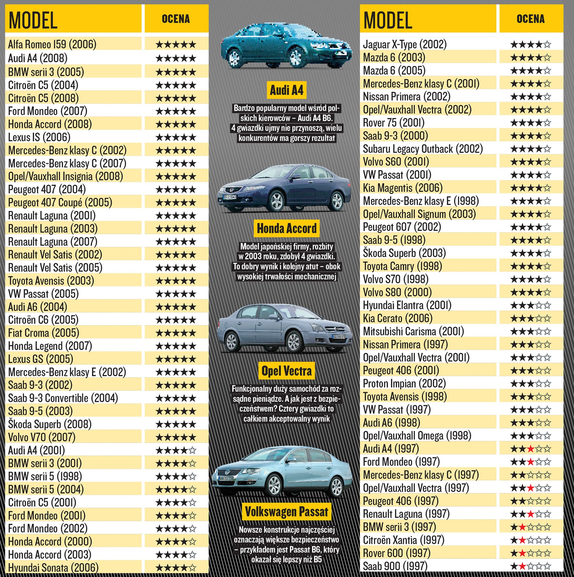 Tabele opracowaliśmy na podstawie wyników testów Euro NCAP przeprowadzonych do 2009 r. – wtedy jeszcze nie było oceny końcowej. Opieramy się na stopniu zabezpieczenia dorosłych osób. Czerwona gwiazdka oznacza, że auto na nią zasłużyło (ma odpowiednią liczbę punktów), ale w czasie badań „życie” manekinów było zagrożone.