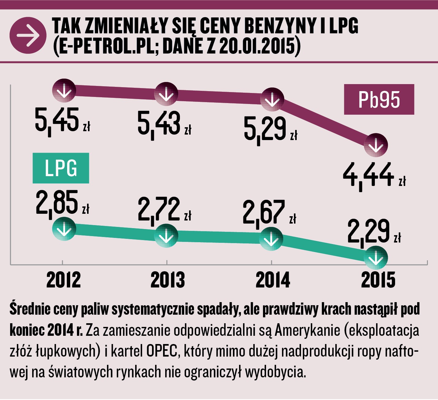 Zaczęło się od łupkowego boomu w USA i decyzji OPEC, żeby nie ograniczać wydobycia ropy naftowej mimo dużej nadprodukcji. Dzięki temu ceny paliw osiągają dziś poziomy najniższe od kilku lat, a kierowcy na całym świecie liczą zaoszczędzone pieniądze. Co chwila pękają kolejne bariery psychologiczne.