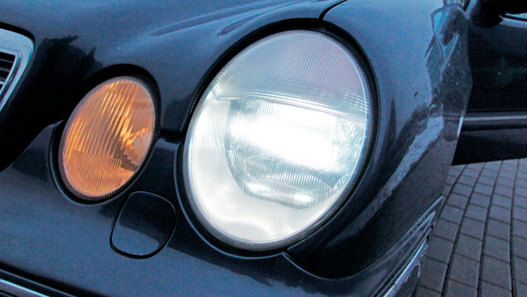 Charakterystyczny reflektor bez soczewki Mercedesa W210 jest zwykle kompletnie wypalony. Pomimo zastosowania nowego palnika nie ma szans, aby taki reflektor zapewnił zadowalające oświetlenie drogi.