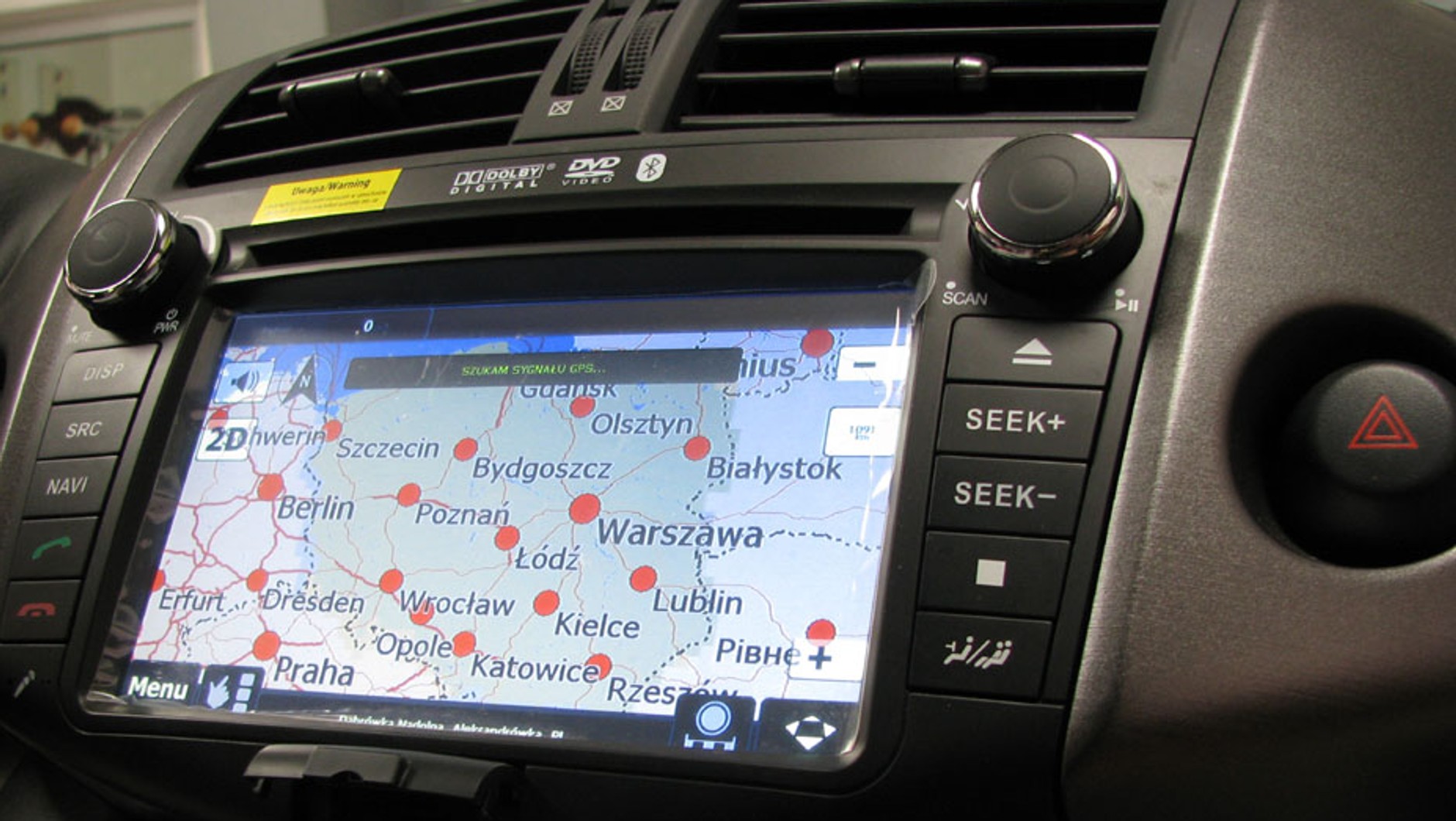 5. Zastosowany wyświetlacz jest bardzo dobrej jakości. Matryca ma wystarczająco dobre podświetlenie – nawet w trakcie słonecznego dnia bez problemu zobaczymy wszystkie kluczowe wskazania na ekranie. Przed pierwszym użyciem lepiej zdjąć fabryczną folię ochronną. Choć chroni ona ekran przed zarysowaniem, to jednak ogranicza komfort spoglądania na niego, szczególnie w trakcie słonecznych dni. Podczas jazdy po zmierzchu folia nie przeszkadza. Co ważne, jasność ekranu zmienia się po włączeniu świateł przełącznikiem przy kierownicy. Warto zatem w serwisie ustawić tryb automatycznego włączania świateł do jazdy dziennej (radio nie zmniejsza wówczas jasności ekranu). Podczas jazdy po zmierzchu można włączyć światła przełącznikiem przy kierownicy, a sprzęt zmniejszy poziom jasności, by nie przeszkadzała kierowcy.