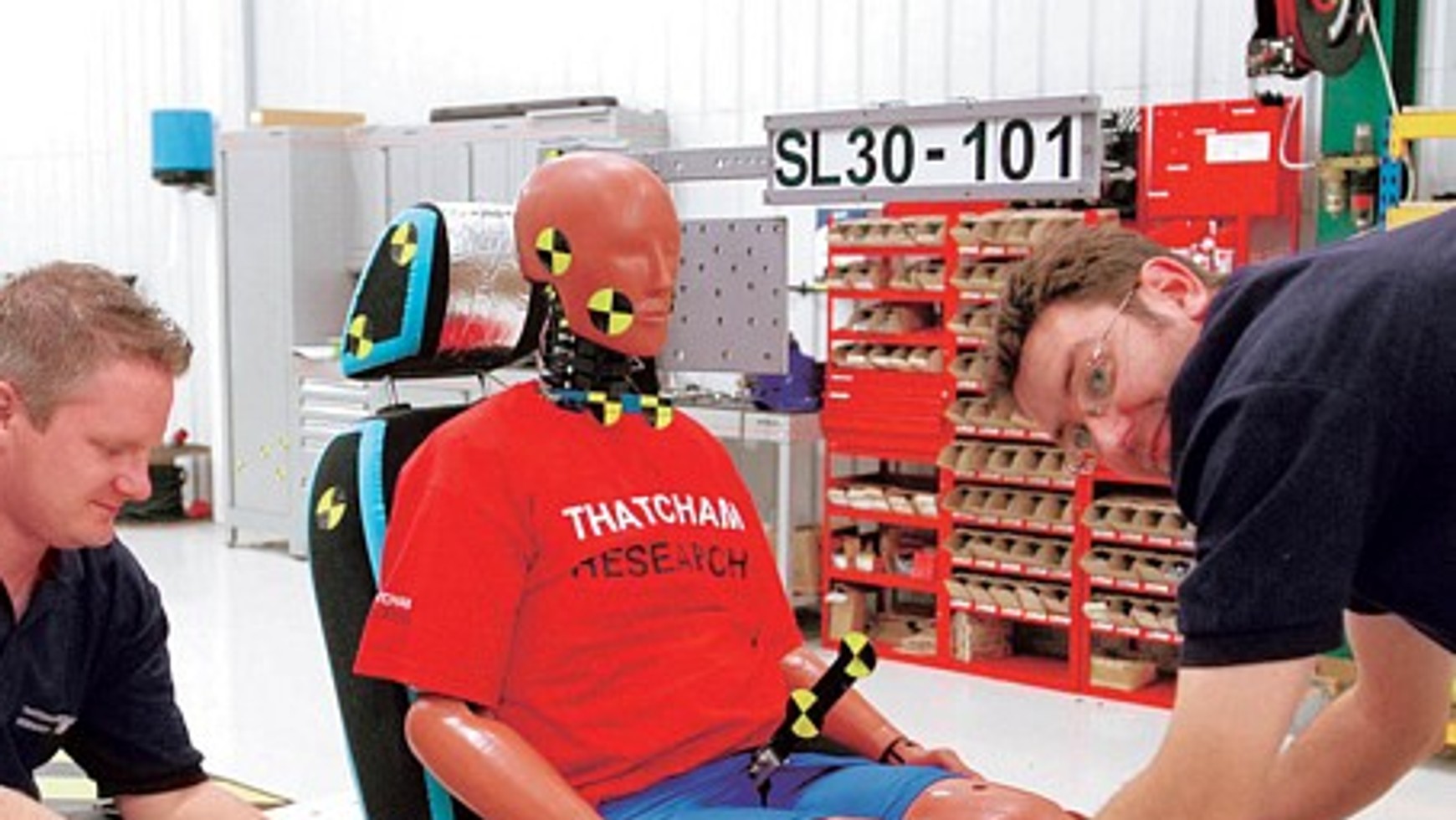 Potem następuje silne uderzenie wyrzucające najpierw jego korpus, a następnie głowę do przodu. Ułamek sekundy później manekin znowu odbija się do tyłu,a na końcu znowu do przodu. Już od samego patrzenia robi się nieprzyjemnie.To, co jest w ten sposób symulowane w centrum badawczym Tatcham (Wielka Brytania), w rzeczywistości zdarza się na ulicach tysiące razy. Jedno auto najeżdża na tył drugiego - nawet przy niewielkich prędkościach pasażerowie często doznają poważnych urazów kręgosłupa szyjnego. Koszty społeczne tego typu wypadków szacowane są w całej Europie na ok. 10 miliardów euro. Jak twierdzi Maude Rivere ze szwajcarskiej firmy ubezpieczeniowej Winterthur, straty spowodowane urazami kręgosłupa szyjnego w okresie od 1996 do 2003 roku podwoiły się.Ubezpieczyciele szacują, że co najmniej co trzeci taki uraz mógłby się nie zdarzyć, gdyby w pojazdach montowano lepsze fotele i zagłówki. Z tego powodu ubezpieczyciele wywierają coraz większy nacisk na producentów aut. W ciągu ostatnich trzech lat pracujący na ich zlecenie specjaliści z Europy, USA oraz Australii opracowali jednolitą metodologię badań foteli samochodowych.Dotychczas w instytucie Tatcham przetestowano przy uwzględnieniu tych kryteriów 111 przednich foteli z różnych samochodów. Wyniki są zastraszające!Ponad 60 proc. wszystkich testowanych modeli wypadło słabo albo źle. Niemal 20 proc. nie sprostało nawet podstawowemu kryterium - zagłówek musi dać się ustawić tak, aby kończył się na wysokości czubka głowy w niezbyt dużej odległości od niej. Tam, gdzie nie było to możliwe, bez prób zderzeniowych przyznawano złą ocenę ogólną.Auta niemieckich producentów wypadły bardzo słabo: BMW otrzymało za standardowy fotel modelu serii 3 oraz za fotel z manualną regulacją modelu serii 5 złą ogólną ocenę. To samo dotyczy Mercedesa klasy C. Najgorsze noty zebrał również Volkswagen i to w przypadku aż 4 modeli: Polo, Sharana, Passata i Bory. Wielkim zwycięzcą okazało się Volvo: pięć ocen dobrych. Mimo że przegrani testu deklarują wątpliwości co do miarodajności testów polegających na selektywnym badaniu wymontowanego z auta fotela, to jednak wydaje się, że wyciągnęli pewne wnioski. Volkswagen już ogłosił, że w przyszłości nowe modele otrzymają lepsze zagłówki. Również w autach BMW aktywne zagłówki (poruszające się w kierunku głowy pasażera, zapobiegające nadmiernemu rozciągnięciu kręgosłupa szyjnego) mogą trafić w przyszłości do wyposażenia seryjnego. Zdaniem eksperta w dziedzinie biomechaniki, dr Wolframa Hella z Uniwersytetu Monachijskiego, to najwyższy czas, żeby podjąć takie działania. "Od lat ostrzegamy, że fotele nie zapewniają odpowiedniego poziomu bezpieczeństwa w czasie wypadków. Branża motoryzacyjna wiedziała, że opracowywane są jednolite zasady testowania foteli. Niektórzy producenci uznali to za powód do poprawienia w ciągu ostatnich lat poziomu bezpieczeństwa, inni nie zrobili nic. Wynik niemieckich aut można było przewidzieć" - ostrzega specjalista. Pozostaje mieć nadzieję, że w następnych latach wyniki nowych modeli będą dużo lepsze. W końcu już tylko patrząc na manekin BioRID "w trakcie pracy", można się przestraszyć.