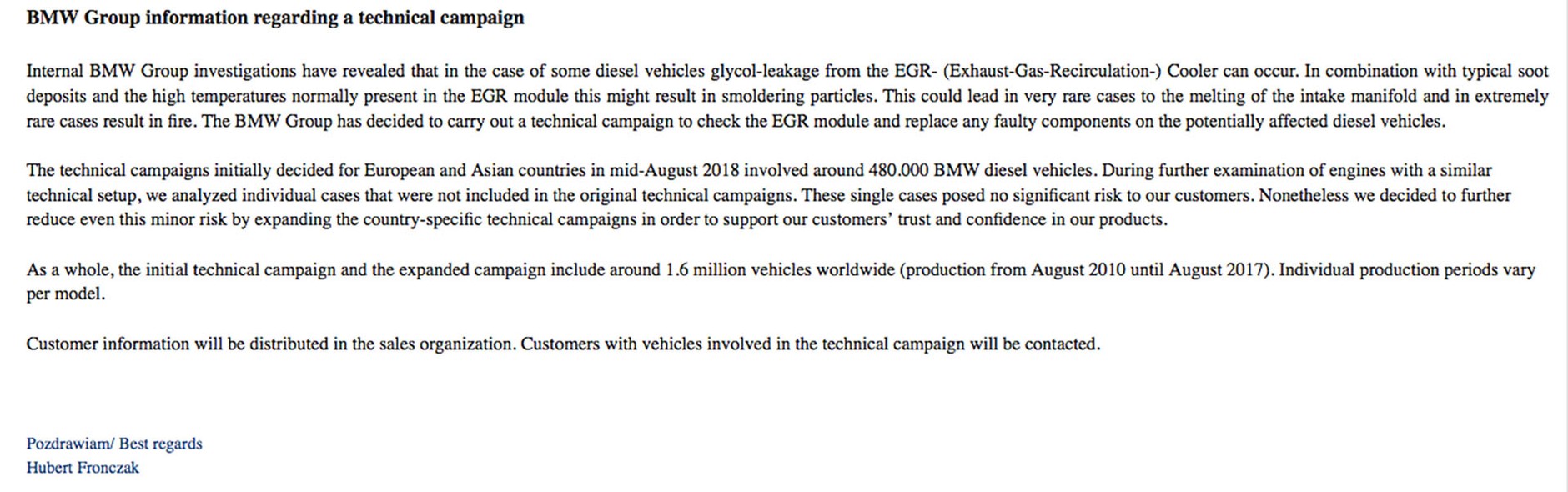 Do chwili publikacji materiału jedyne, czym dysponowaliśmy, to oficjalna, anglojęzyczna wersja oświadczenia od działu PR BMW Polska, potwierdzająca istnienie problemu. Dokument wyjaśnia, że do pożaru może dojść w wyniku wycieku z modułu EGR i nadtopienia kolektora ssącego, ale że są to przypadki ekstremalnie rzadkie. Próżno szukać listy modeli objętych akcją. Nie dostaliśmy też, niestety, odpowiedzi na pytanie, dlaczego w przypadku nadpalonego BMW 535d pana Marka importer odmówił partycypacji w kosztach. Czy dlatego, że VIN tego samochodu nie figurował na liście zagrożonych problemem, a „piątka” została jako używana przywieziona z Niemiec? Według PR-u BMW Polska pan Marek „otrzymał wszelkie stosowne informacje na temat napraw, gwarancji”.