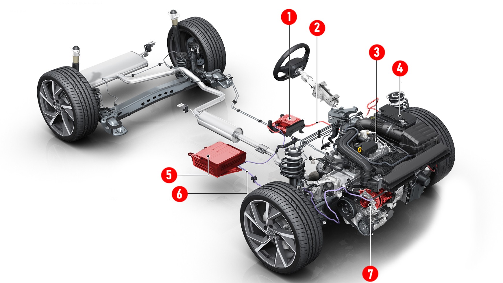 3: Silnik spalinowy – klasyczna jednostka benzynowa lub diesel. Układ mHEV jest stosowany zarówno w małych silnikach, jak i potężnych, np. 3.0 V6/R6.