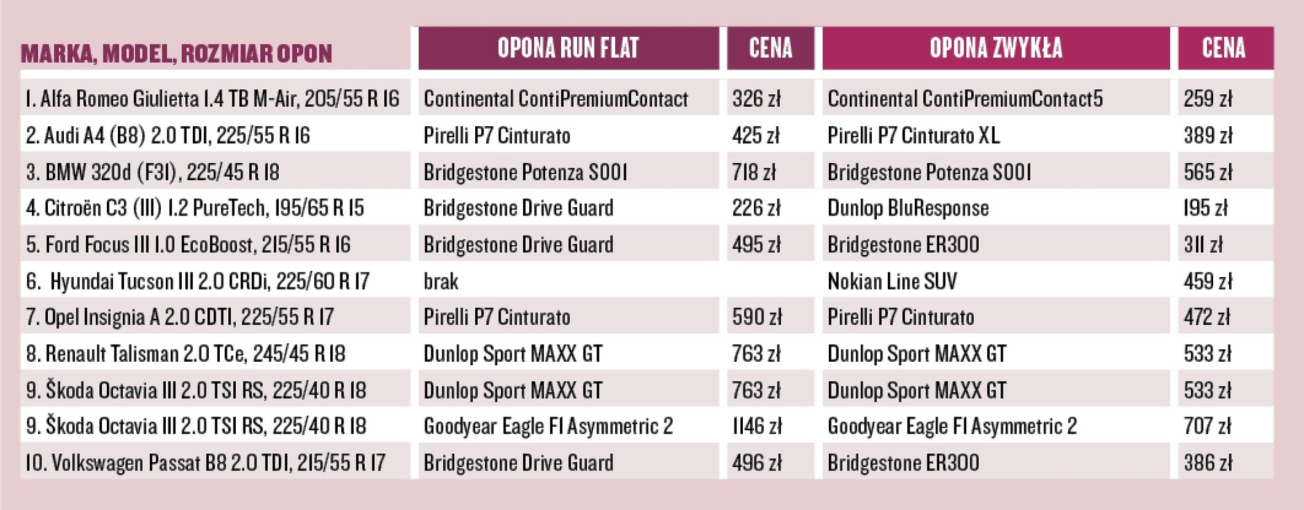 Ważne: ceny są orientacyjne, zaczerpnięte z dużej internetowej hurtowni. W zależności od serwisu oponiarskiego wymiana run flatów potrafi być nieco droższa. Kierowcy szczególnie wyczuleni na ceny podzespołów mogą narzekać też na to, że run flatów w zasadzie nie ma w ofercie tańszych producentów ogumienia – w klasie budżetowej jesteśmy skazani na opony standardowe.