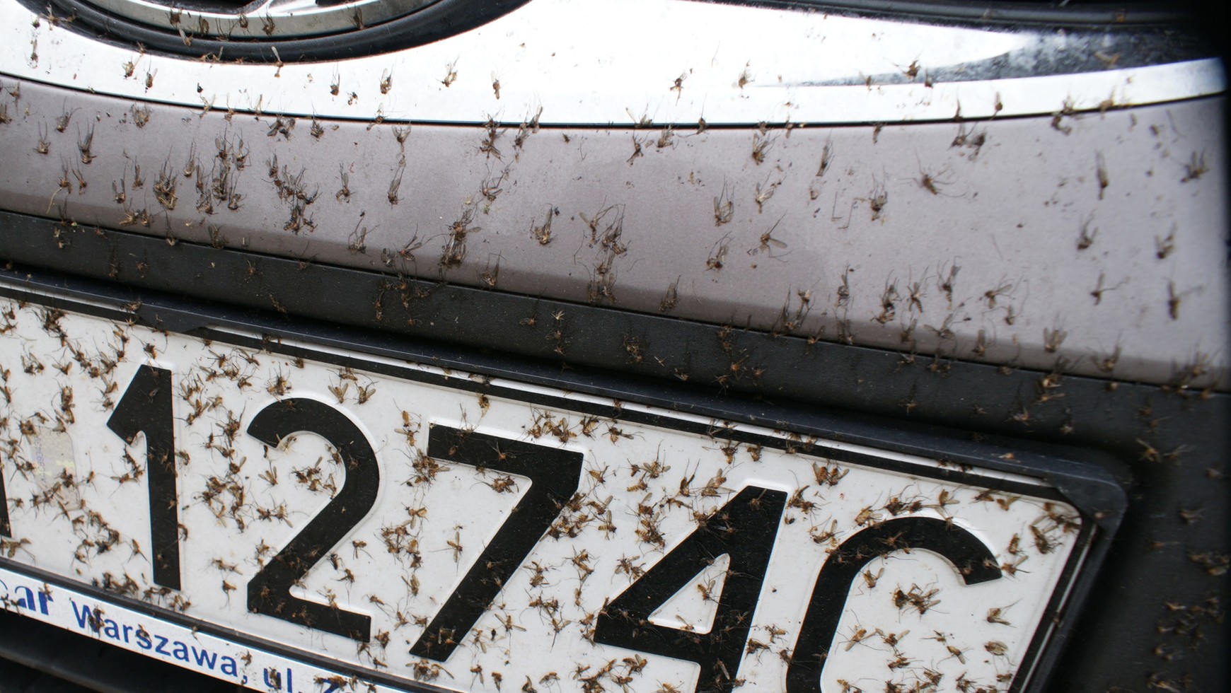 Jeśli pod ręką nie mamy specjalnego środka do zmywania owadów, można użyć szamponu samochodowego (tzn. wodnego roztworu szamponu) albo płynu do szyb, może być letni płyn do spryskiwaczy. Jeśli wydaje się on nieskuteczny to... z tego samego powodu, co specjalne preparaty do zmywania owadów. Szybko odparowuje, a potem szorujemy już na sucho... Płyn do szyb sprawdza się, tylko nie wolno go żałować. Owadzie zwłoki muszą mieć czas, by "namięknąć".