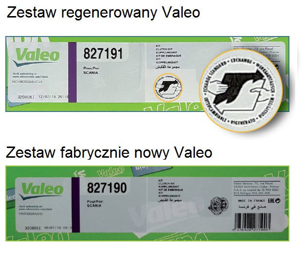 Mimo tożsamej jakości sprzęgieł nowych i regenerowanych, Valeo dokłada starań, by nabywca produktów firmy otrzymywał zawsze pełną informację o tym, co kupuje. Właśnie dlatego Valeo Service stosuje oddzielne numery referencyjne dla sprzęgieł nowych i regenerowanych. Dotyczy to zarówno zestawów sprzęgłowych jak i tych komponentów sprzęgła, które mogą podlegać regeneracji, czyli tarcz dociskowych i tarcz sprzęgłowych. Ponadto, regenerowane zestawy sprzęgła Valeo są opisane w katalogu TecDoc jako REMANUFACTURED oraz oznaczone symbolem wymiany serwisowej, którym są dwie połączone strzałki – zielona i czerwona. Nowe zestawy sprzęgła są w TecDoc opisane zawsze jako NEW.