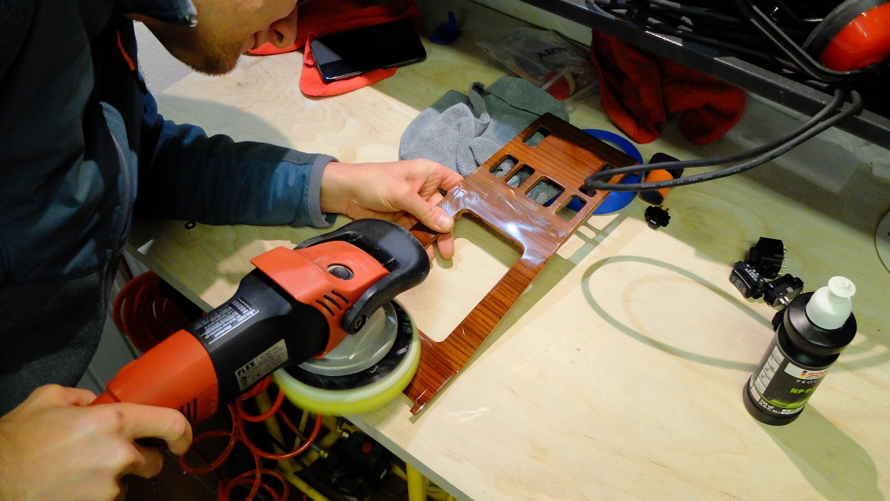 Zwłaszcza głęboko zabudowane panele najlepiej jest zdjąć, a jeśli nie można, potrzebna będzie jeszcze taśma maskująca do ochrony sąsiadujących elementów. To w zasadzie tyle – mamy pastę, coś do polerowania – zaczynamy!