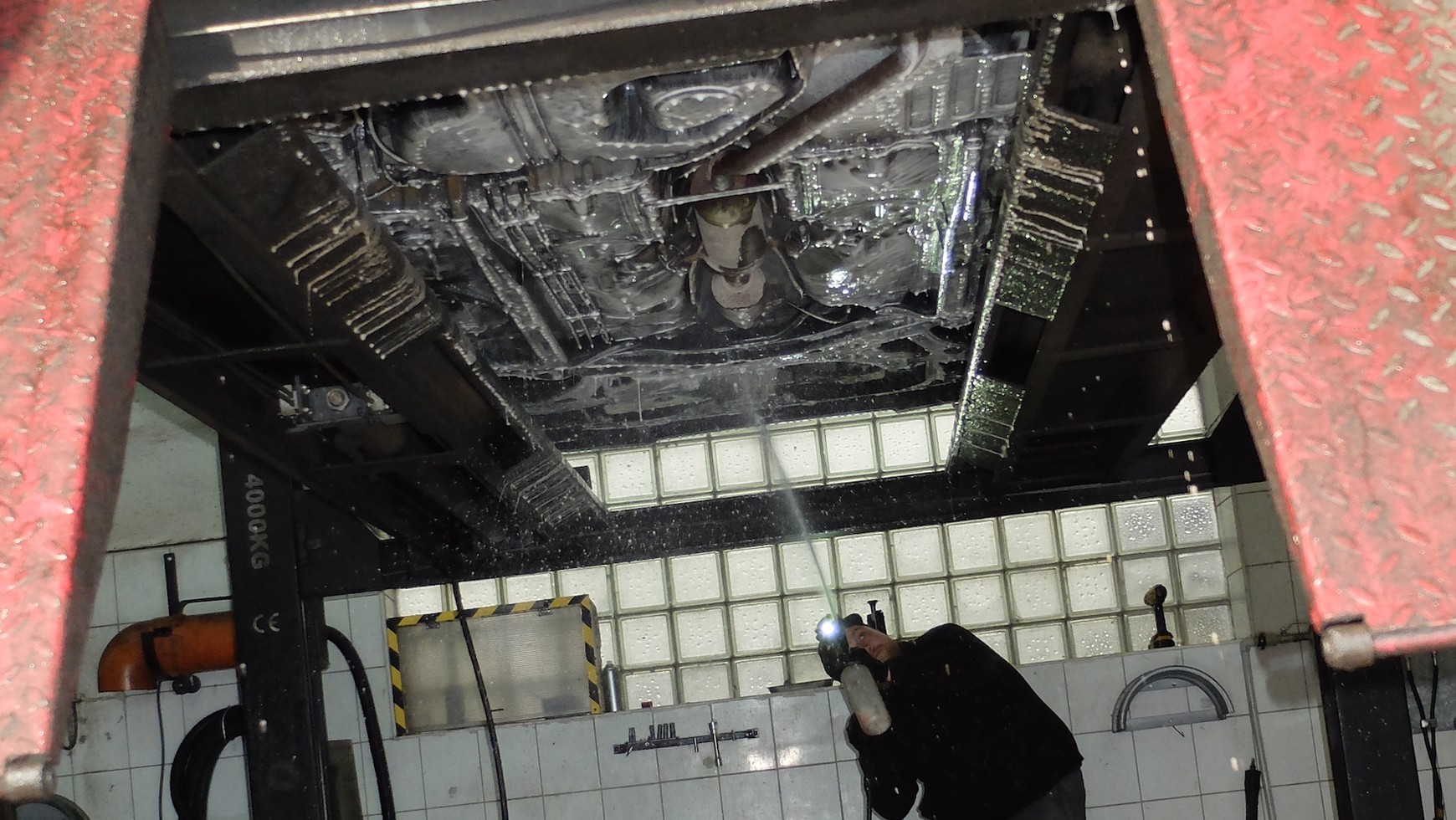 Mycie wstępne: fachowiec myje podwozie ze wszystkich zalegających zanieczyszczeń – chodzi zarówno o sól, jak i błoto, piach itp. Potem nakładany jest środek neutralizujący sól (na zdjęciu) – musi dotrzeć do każdego zakamarka. Preparat odsalający zostaje spłukany przeważnie po 5-10 min. To też czasochłonny etap – preparat musi zostać dokładnie usunięty ze wszystkich zakamarków.