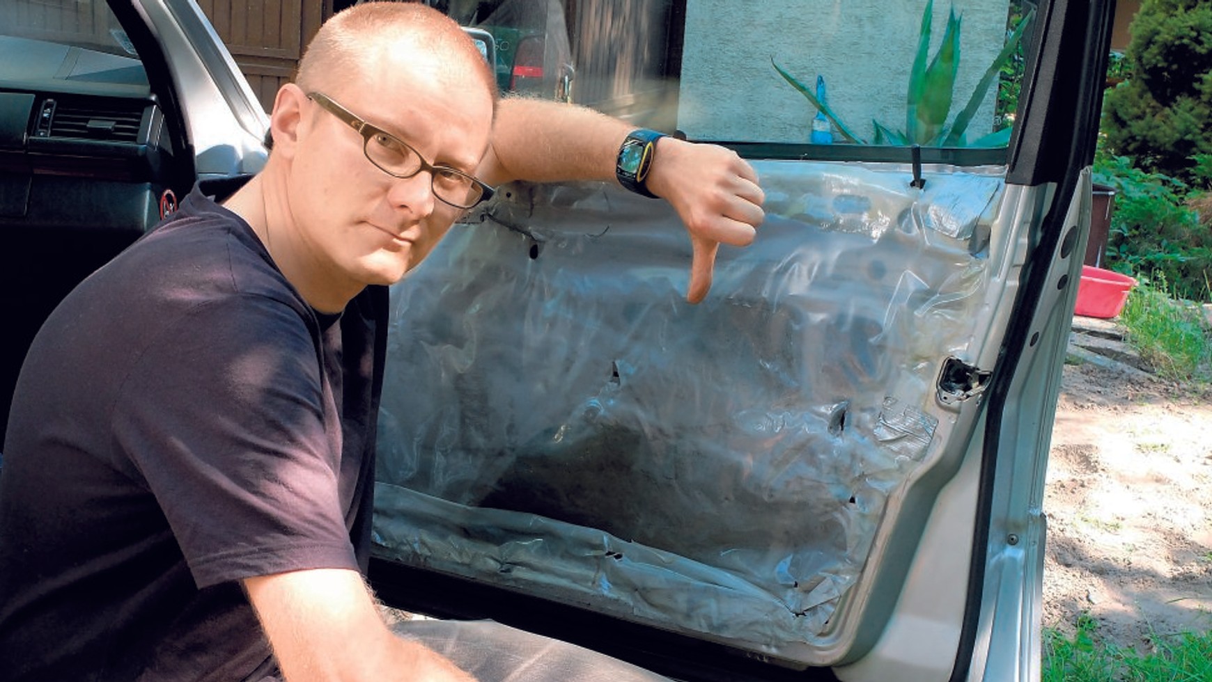 Montaż mat wygłuszających. Pełne wygłuszenie uzyskamy, wyklejając najpierw zewnętrzne poszycie drzwi, jednak nawet wariant skromniejszy – wygłuszenie pomiędzy tapicerką a konstrukcją drzwi – daje niezły efekt, szczególnie jeśli fabryczna folia była już kiedyś odrywana lub sztukowana. Maty są samoprzylepne, tańsze produkty wymagają formowania na ciepło (przyda się opalarka), droższe – łatwo można formować palcami na zimno.