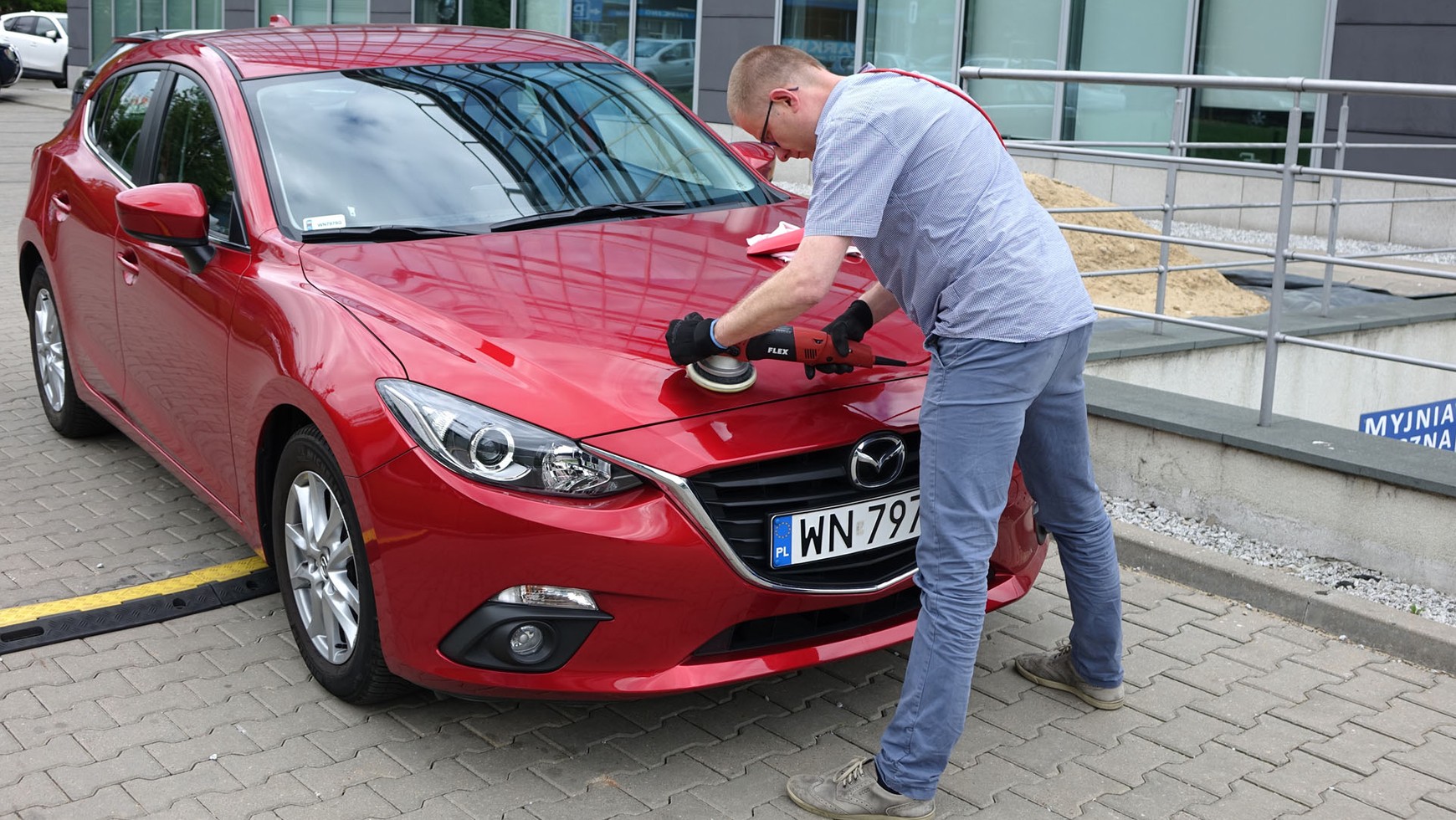 Można ręcznie, ale znacznie lepiej maszynowo, za pomocą polerki. Optymalna byłaby polerka rotacyjno-mimośrodowa (tzw. polerka DA – Dual Action), ale ostatecznie, z dużą ostrożnością można użyć taniej polerki obrotowej. W tym drugim przypadku, szczególnie jeśli lakier jest delikatny, radzimy użyć pasty wykończeniowej (a nie silnie tnącej) i miękkiej nakładki polerskiej – praca potrwa dłużej, ale efekt będzie lepszy. Przydatnym narzędziem będzie miernik grubości lakieru – pomoże w ocenie sytuacji.