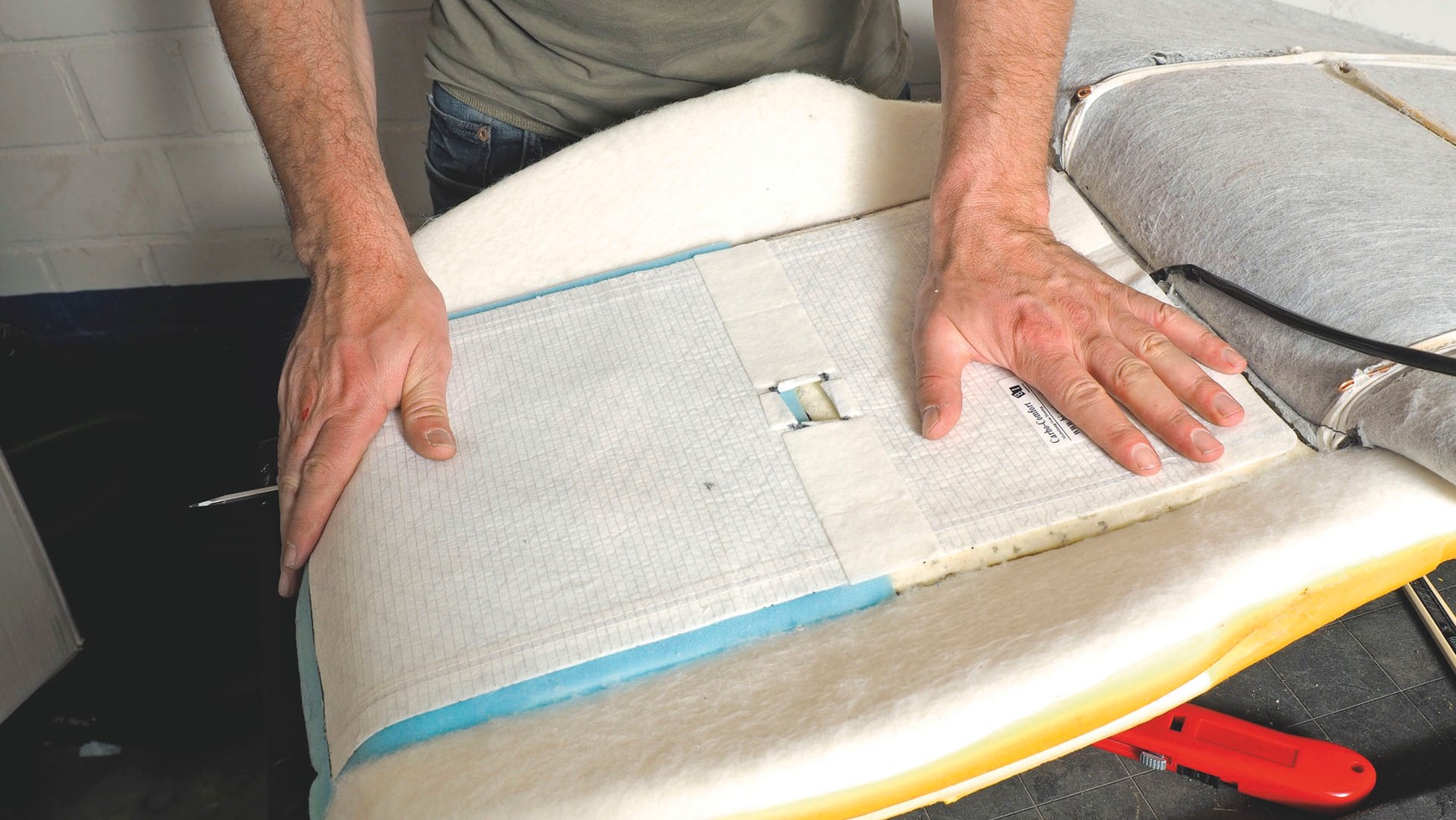 Wycinanie otworów: maty grzewcze zrobiono tak, że można je docinać. Tu widać otwór na zapięcie mocujące materiał siedziska.