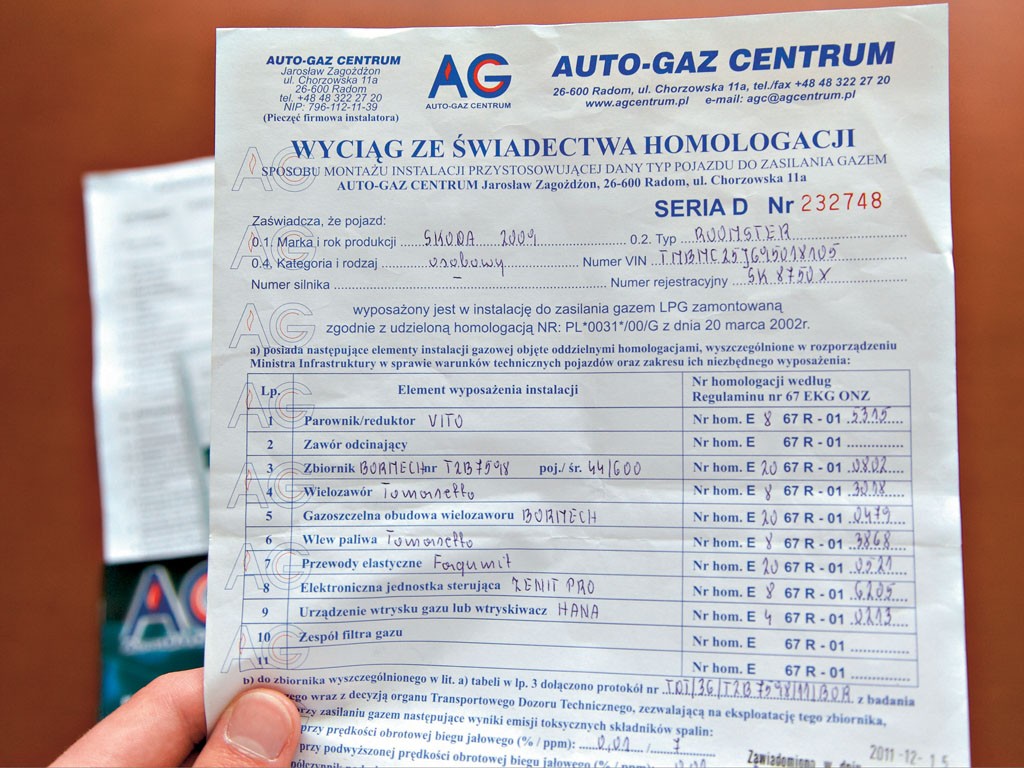 Tak naprawdę większość potencjalnych kłopotów ogranicza się wyłącznie do dokumentacji, którą wydają warsztaty zajmujące się montażem instalacji gazowych. Serwis musi dać wam: wyciąg ze świadectwa homologacji sposobu montażu, atest zbiornika gazowego – zwany najczęściej paszportem butli – oraz fakturę lub rachunek za montaż instalacji. Bez tych dokumentów nie uda się zalegalizować (czyli umieścić adnotacji w dokumentach) układu LPG/CNG. Dwa pierwsze będą wam potrzebne także podczas corocznego badania technicznego w stacji kontroli pojazdów.