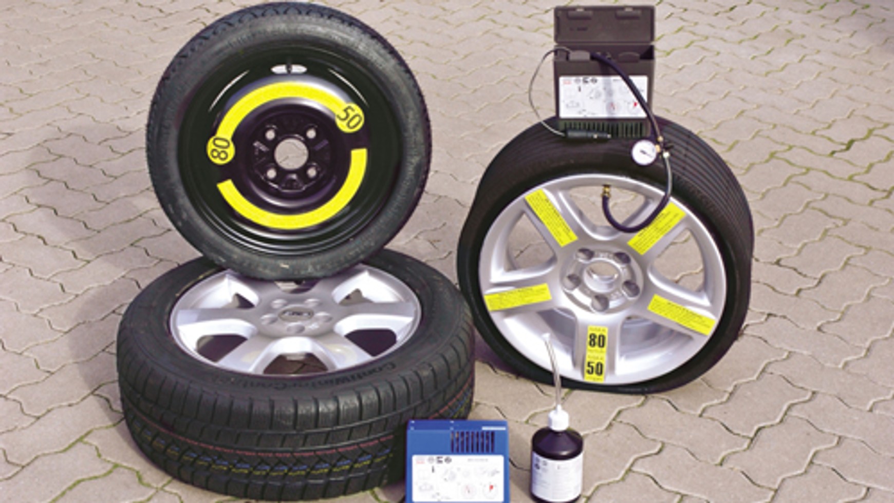 Coraz popularniejsze rozwiązanie - spotykane np. w wielu nowych Volkswagenach. Zestaw składa się z niewielkiego kompresora zasilanego z gniazda zapalniczki oraz specjalnej masy uszczelniającej. Głównymi zaletami takiego zestawu są niewielka masa oraz rozmiary - bez problemu mieści się w saszetce wielkości samochodowej apteczki. Niestety, sprawdza się tylko w przypadku niewielkich uszkodzeń opon.