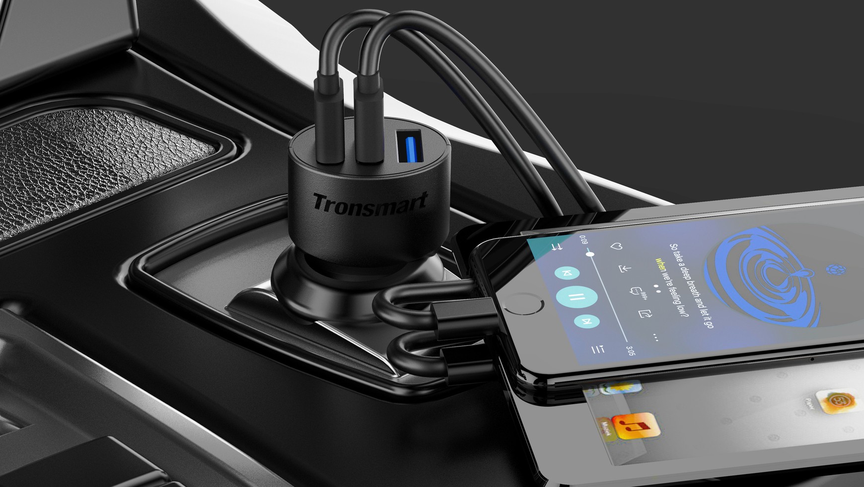 W zestawie znajdziemy kabel o długości 100 cm z dwoma różnymi wyjściami USB 2.0 oraz USB typu C. Użytkownikom sprzętu Apple polecamy natomiast wysokiej klasy ładowarkę samochodową Moshi Revolt Duo -