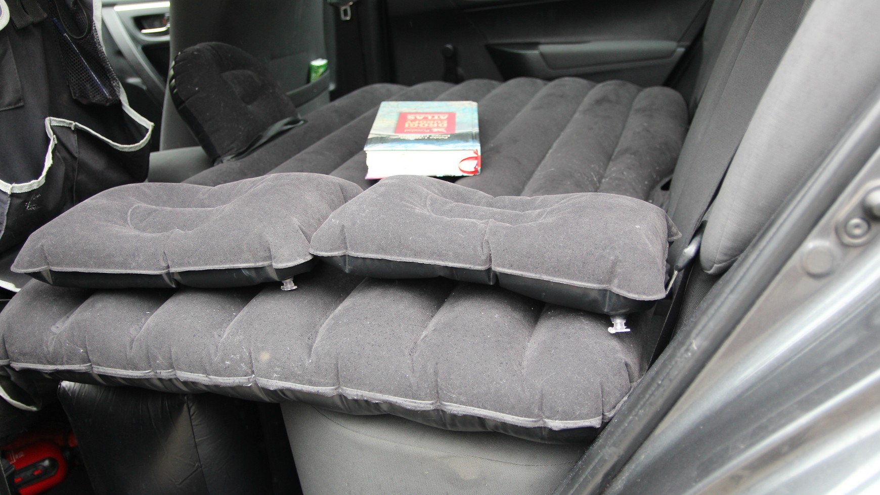 Łóżko samochodowe składa się bowiem z dwóch części: właściwego materaca (na którym się leży) oraz dmuchanej podłużnej poduszki, którą umieszcza się na tylnych dywanikach. Poduszka pełni rolę podpórki zapobiegającej zapadaniu się materaca i pozwala utrzymać go w poziomie. Przy odrobinie ekwilibrystyki – układając się wzdłuż przekątnej, opierając głowę o tylne drzwi, podkulając nogi – można uzyskać zadowalający efekt.