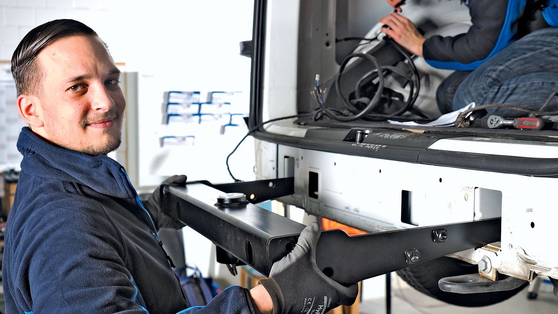 W widocznym na tym zdjęciu busie VW T6 rama nośna haka zastępuje fabryczną belkę zderzaka. Elementy montażowe konstrukcji nośnej haka są wsuwane w otwory tylnych podłużnic i przykręcane z wykorzystaniem fabrycznych otworów – drobnych przeróbek wymaga w tym przypadku tylko wewnętrzna część poszycia zderzaka. Widoczny na zdjęciach hak marki Westfalia (z wypinaną kulą) kosztuje ok. 1450 zł bez wiązki elektrycznej.