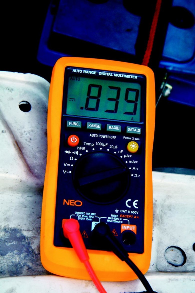 3. Przyłóż jedną końcówkę miernika do wolnego zacisku baterii, drugą do zdjętej klemy. Odczytaj wynik. Odłączając poszczególne urządzenia (radio, alarm), dowiesz się, co pobiera za dużo prądu.