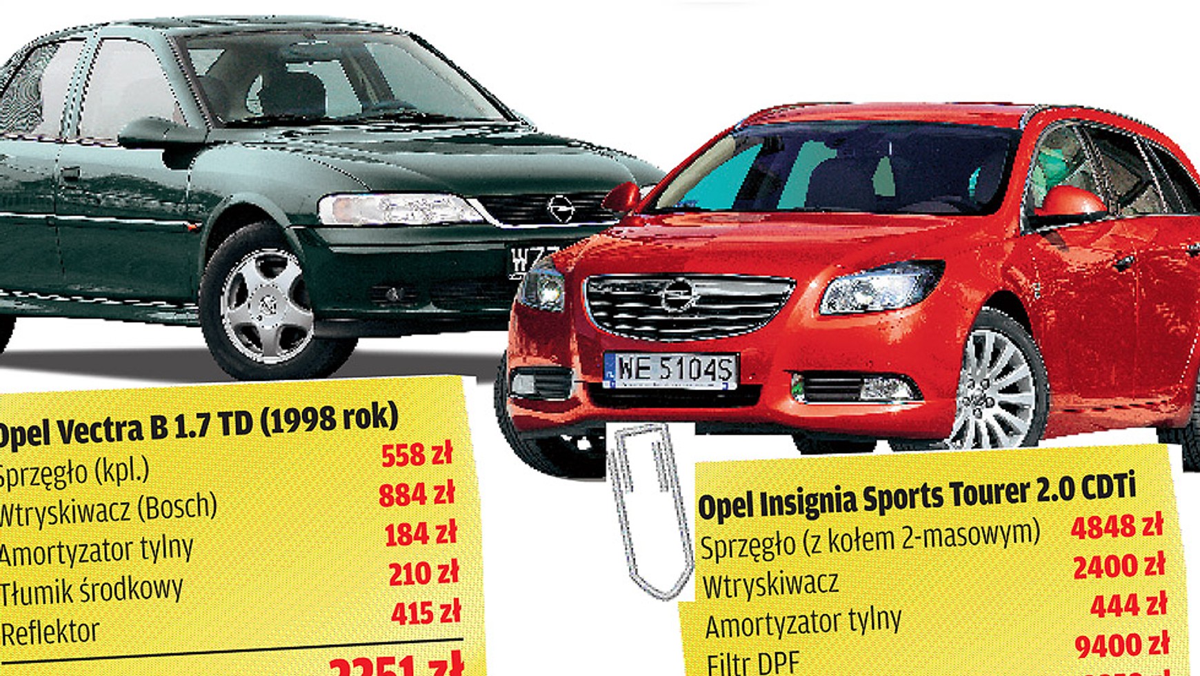 Różnice w cenach części do aut nowych i starszych, budowanych według innej filozofii, mogą szokować. Oczywiście, nie są to takie same części, bo np. tam, gdzie w starej Vectrze jest zwykły tłumik, w Insignii z silnikiem Diesla pracuje filtr cząstek stałych, za który zapłacimy ponad 40 razy więcej.