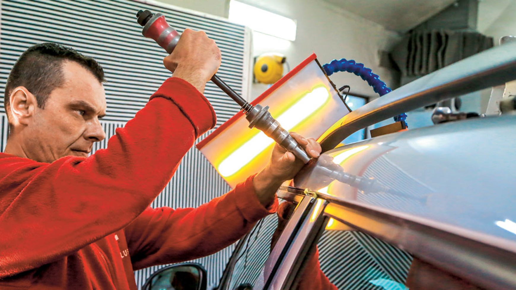 Zasadniczo wyróżniamy dwa sposoby naprawy. Po pierwsze, jeśli do danego wgniecenia można dostać się od tyłu (np. drzwi), fachowiec stosuje specjalnie wyprofilowaną dźwignię, za pomocą której wypycha blachę. Po drugie, jeśli uszkodzeniu uległ trudny fragment karoserii (np. rant, krawędź, słupek, profil zamknięty), konieczne będzie zastosowanie tzw. glue pullera, czyli plastikowego grzybka, na gorąco naklejanego w miejscu uszkodzenia. I dopiero do tego plastikowego „haczyka” fachowiec mocuje specjalny młotek udarowy, dzięki któremu może zlikwidować uszkodzenie. Ciekawostka: wgniecenia najczęściej usuwa się z naddatkiem, a następnie niweluje (patrz też ramka powyżej).