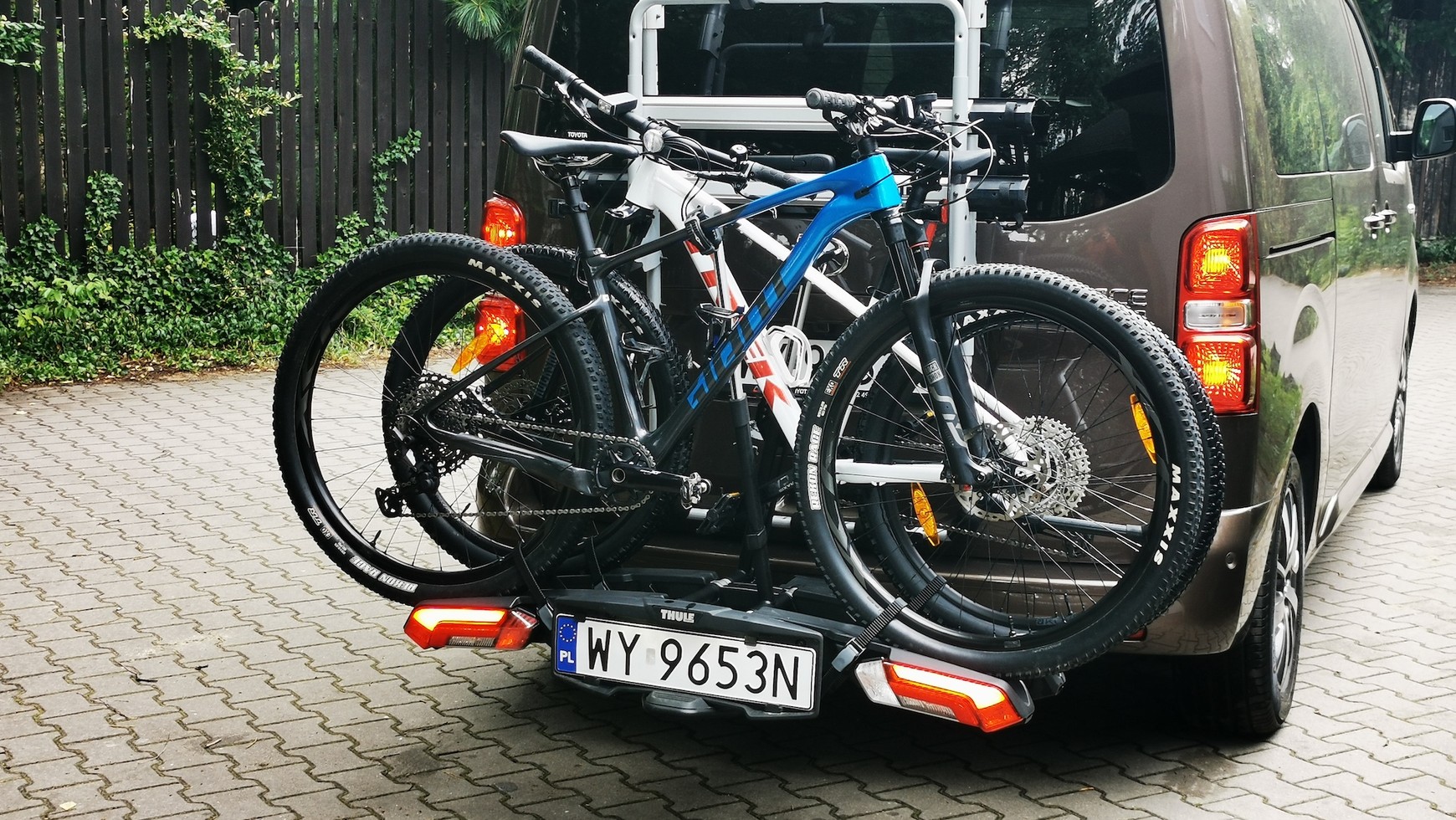 Nie każdy wie, ale w przypadku wielu modeli bagażników wybór bardziej pojemnej opcji (np. na trzy rowery zamiast wersji na dwa), jeśli bierzemy większą wersję bagażnika nie z doraźnej potrzeby, a wyłącznie na wszelki wypadek, ma swoje słabe strony. Chodzi o to, że bardziej pojemne wersje są często bardziej "skompaktowane" w ten sposób, że odstęp pomiędzy rowerami jest zmniejszony z 22-25 cm do np. 19 cm. Wówczas dostajemy większy bagażnik na trzy rowery, ale w praktyce wygodnie przewieziemy tylko dwa. To ważne zwłaszcza w przypadku nowoczesnych rowerów MTB, które mają szersze ośki, masywne amortyzatory i na wąskich bagażnikach słabo się mieszczą. Thule Epos idzie z duchem czasu i niezależnie od wersji przewiduje na każdy rower 25 cm przestrzeni. To także jedna z różnic pomiędzy nowym Eposem a starszym modelem Thule EasyFold, który jest ciaśniejszy. W zaistniałym układzie Epos na trzy rowery, który kosztuje niewiele więcej od wersji na dwa, to opcja bardziej kusząca. Jedyna potencjalna wada wersji na trzy rowery to większe (ale wciąż rozsądne) rozmiary sprzętu po złożeniu w kostkę.