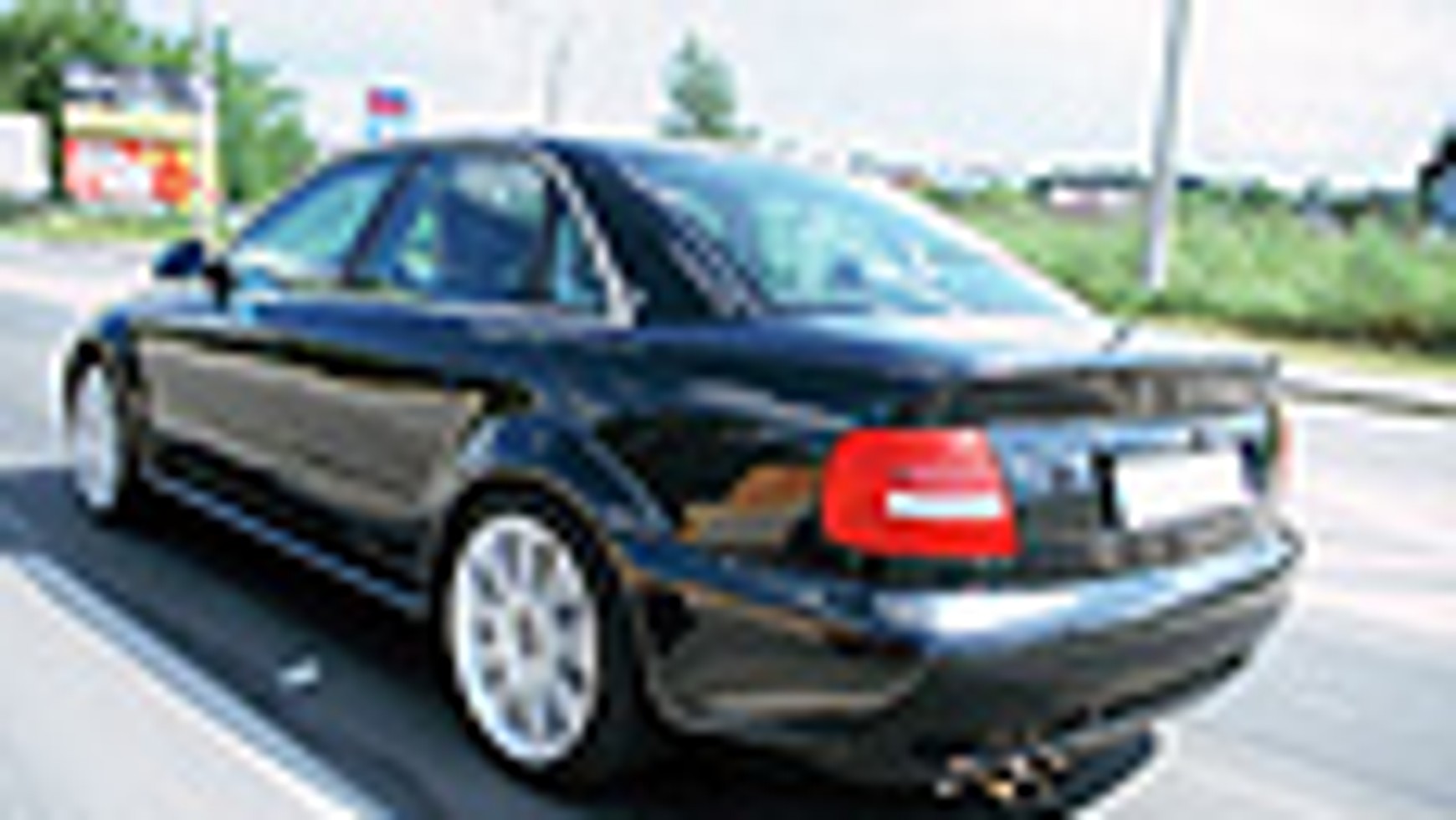 7 biturbo. Samochód miał jednak jedną wadę, występował tylko w wersji kombi. Rafał Starczewski nie chciał jeździć kombi, postanowił więc stworzyć coś, czego nie robi fabryka - RS4 sedana. Bazą do tuningu było A4 quattro 2.8. Auto zakupił w sierpniu 2003 r. Przedtem nabył jednostkę 2.7 biturbo (265 KM) i zaprojektował przebudowę pojazdu na RS-a. Większość modyfikacji przeprowadzano w firmie Lecha Koraszewskiego. Zaczęto od karoserii. Oryginalne A4 miało kolor ceglasty. Doprowadzenie nadwozia do aktualnego stanu trwało trzy miesiące. Z A4 pozostał jedynie szkielet karoserii. Zmodyfikowano lub wymieniono wszystkie elementy nadwoziaNajwięcej problemów sprawiło wymodelowanie tylnych błotników na wzór RS4. Poza klapą bagażnika reszta elementów karoserii pochodzi z RS4. Z usportowionego Audi przejęto np. zderzaki oraz progi. Zaspawanie zamków wygładziło pojazd, a lakier czarny metalik nadał mu ekskluzywny wygląd. W trakcie prac nad stylizacją zewnętrzną przygotowywano się do modernizacji wnętrza. Fotele od Audi TT i tylna kanapa trafiły do szczecińskiego tapicera. Tam pokryto skórą także mieszek lewarka zmiany biegów i podłokietnik oraz boczki drzwi. Przed wstawieniem silnika wykonano przeróbki, które miały poprawić osiągi. Poszerzono m.in. kanały dolotowe w głowicy i zmodyfikowano kolektor ssący. Turbiny pochodzą od RS4, podobnie jak pompa paliwa, intercoolery, przewody w układzie dolotowym oraz przepływomierz i obudowa filtra powietrza. Wstawiono wydajniejsze wtryskiwacze z RS2. Zamontowano też dodatkowe chłodnice oleju skrzyni biegów i silnika. Przepustnicą steruje teraz nie linka, a elektronika. Silnik połączono ze skrzynią z S4. Początkowo docisk sprzęgła od tego modelu współpracował z metalową tarczą. Jednak szarpanie przy ruszaniu zmusiło Rafała do wstawienia tarczy z RS4. Podczas testów, ze względu na słaby docisk, tarcza nie wytrzymała obciążenia 700 Nm i została "zmielona". Teraz napęd przenosi oryginalne sprzęgło z RS4, a dla bezpieczeństwa elektronika nie pozwala przekroczyć 650 Nm. Zmieniono też podwozie. Z przodu zamontowano aluminiowe zawieszenie z Audi S6 4.2, hamulce z RS6, a półosie z modelu S8. Na obie osie trafiły krótsze o 40 mm sprężyny H&R i amortyzatory Bilstein Sport z S4. Najwięcej kłopotów przysporzyła elektronika. Dużym problemem było połączenie komputera sterującego pracą motoru z S4 przez główną magistralę CAN ze starą elektroniką i nowymi elementami wyposażenia, które nie występowały w bazowym Audi A4, np. zegarami i klimatyzacją z RS-a czy bocznymi poduszkami w fotelach. Wiązkę silnika przełożono na prawo (w S4 jest po lewej stronie). Na strojenie motoru auto trafiło do V-techu. Tam poprawiono też zawieszenie z przodu (okazało się, że jest za niskie na polskie drogi) i zmieniono tylne hamulce, które pochodzą z RS6. Układ dolotowy doposażono w system Aquamist (wtrysk wody obniżający temperaturę w kolektorze ssącym). Na hamowni zarejestrowano wynik - 431 KM i ponad 650 Nm. Parametry pracy silnika jednak nie zadowoliły Rafała, więc wstawił auto do firmy Powertronic. Przyczyną wielu kłopotów okazała się pompa paliwa z RS4, która podawała za małą dawkę paliwa - zastąpiono ją wysoko wydajnym urządzeniem Boscha. Tam zamontowano też zewnętrzny komputer SMT6 sterujący m.in. doładowaniem, dawką paliwa, zapłonem oraz systemem Aquamist. Obecnie doładowanie 1,5 bara uzyskiwane jest już przy 3000 obr./min i utrzymuje się na tym poziomie do prawie 7000. Szacowana moc to około 450 KM.