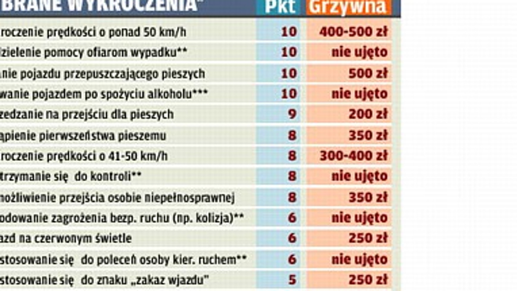 Szanse powodzenia takich negocjacji są niewielkie, bo za większość przewinień przewidziano sztywne kwoty mandatów oraz ilość punktów karnych. Na poważne konsekwencje narażeni są szczególnie piraci drogowi z małym stażem za kierownicą. Jeżeli mają prawo jazdy krócej niż rok, to do jego utraty wystarczy zebranie 21 punktów - odzyskanie uprawnień wymaga ponownego ukończenia kursu i zdania egzaminu. Łagodniej dla doświadczonychW lepszej sytuacji są osoby mające prawo jazdy ponad rok. W ich przypadku dokument jest odbierany, gdy kierowca przekroczy limit 24 punktów. Istnieje możliwość zmniejszenia stanu konta o 6 punktów - trzeba wziąć udział w specjalnym szkoleniu. Wbrew pozorom wcale nie tak trudno ??wyrobić limit", bo wykroczenia popełnione za jednym razem sumują się. Wystarczy np. jadąc bez świateł ze zbyt dużą prędkością, wyprzedzić prawą stroną pojazd przepuszczający pieszych...