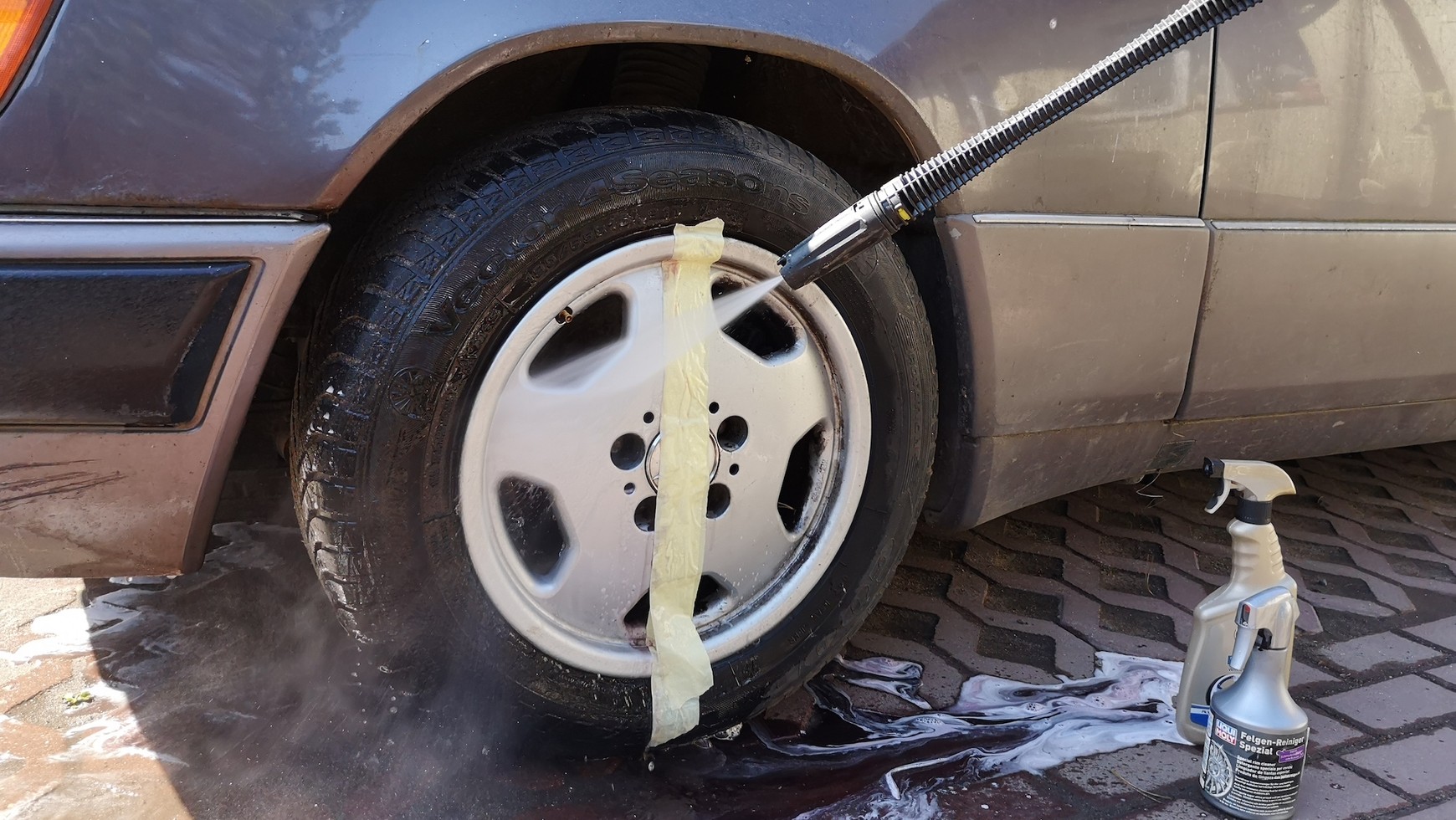 Tak, oczywiście wiemy, że w samochodach przednie koła są bardziej zabrudzone pyłami z klocków hamulcowych niż koła tyle. Bez obaw! W tym konkretnym aucie koła były przekładane, a w międzyczasie nikt felg solidnie nie czyścił – na wszystkich czterech kołach warstwa brudu była więc bardzo zbliżona. Czego o efektach mycia powiedzieć już nie można – po zakończeniu testu wszystkie cztery koła trzeba było raz jeszcze potraktować zwycięskim produktem, żeby stały się równomiernie czyste.