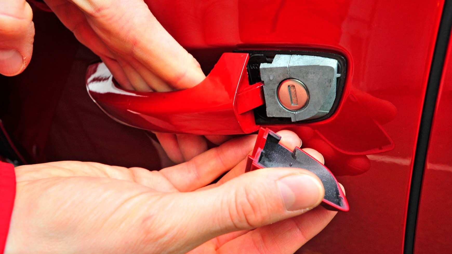 Masz nowoczesne auto z systemem bezkluczykowym albo z zamkiem sterowanym pilotem? Co, jeśli rozładuje się akumulator w aucie albo pilocie? Przecież w nowych autach często nawet nie ma w drzwiach miejsca na kluczyk. Bez obaw! Zamek i miejsce na kluczyk zwykle są (najczęściej tylko w drzwiach kierowcy), ale nie podobają się designerom – więc, żeby się do nich dostać, trzeba usunąć plastikową osłonkę. Ale skąd zdobyć pasujący kluczyk, skoro auto otwierane jest pilotem? To wyjaśnimy przy następnym obrazku!