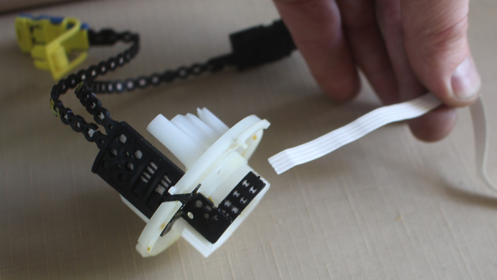 Do wszystkich przełączników i przycisków muszą dochodzić przewody elektryczne. W przypadku elementów umieszczonych na kierownicy nie jest tak prosto – połączenie musi umożliwiać obracanie kierownicą. Najczęściej jest to realizowane przez elastyczną, długą taśmę, która rozwija się i zwija wraz z obracaniem kierownicy. Niestety – z czasem taśma ulega uszkodzeniu i trzeba ją wymienić.
