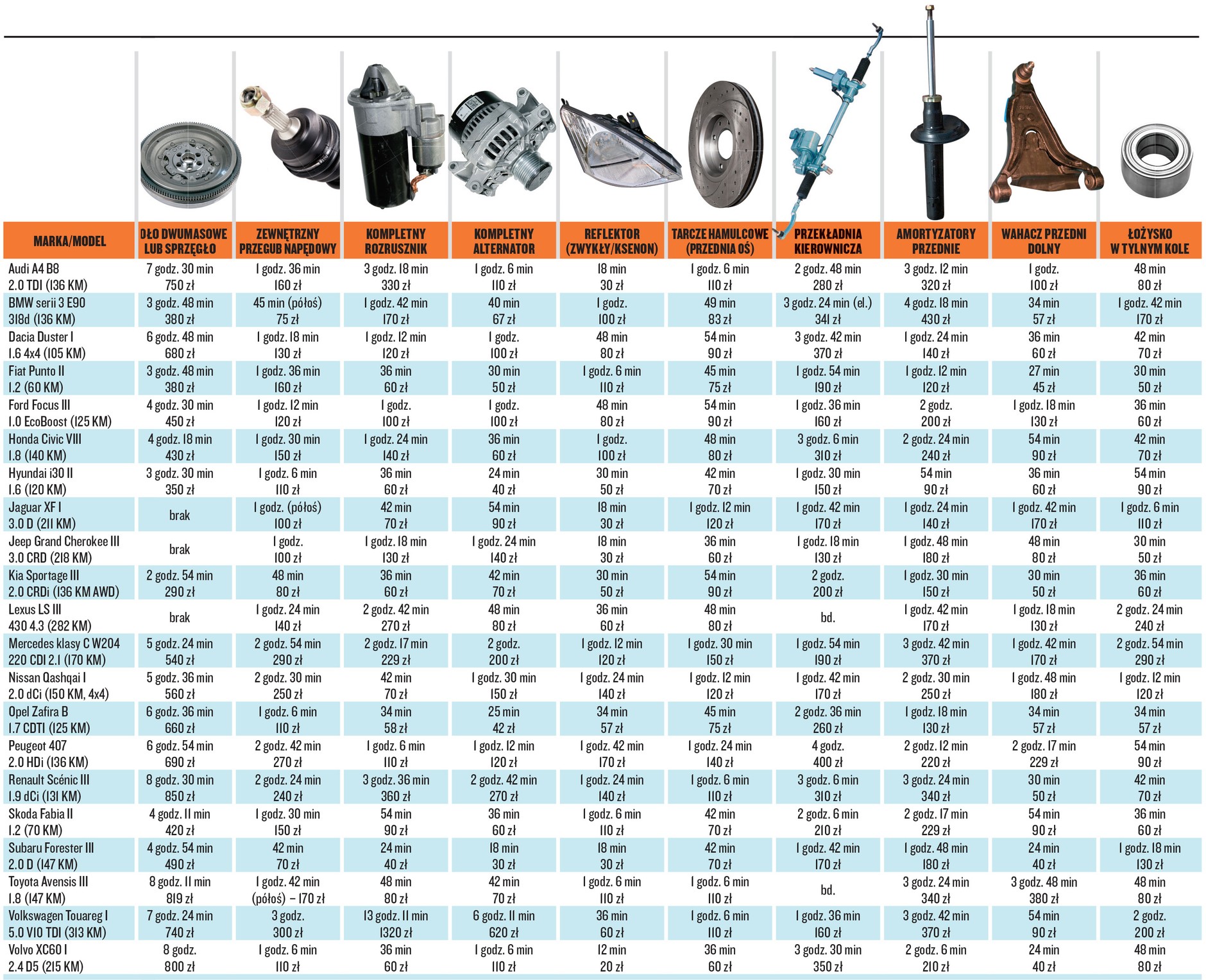 Z pomocą przychodzą programy serwisowe, katalogi z częściami itp. Można tam dowiedzieć się, ile czasu przewidziano na daną operację. Wtedy, przynajmniej teoretycznie, wystarczy przemnożyć czas przez własną stawkę roboczogodziny i mamy koszt usługi. Tyle teorii, w praktyce wygląda to jednak nieco inaczej – katalog operacji przewidziano dla nowego auta. Co prawda, w przypadku wielu operacji pojawiają się zapiski o "utrudnionej wymianie", ale dodatkowe pół godziny często nie wystarczy na walkę z zapieczonymi śrubami.