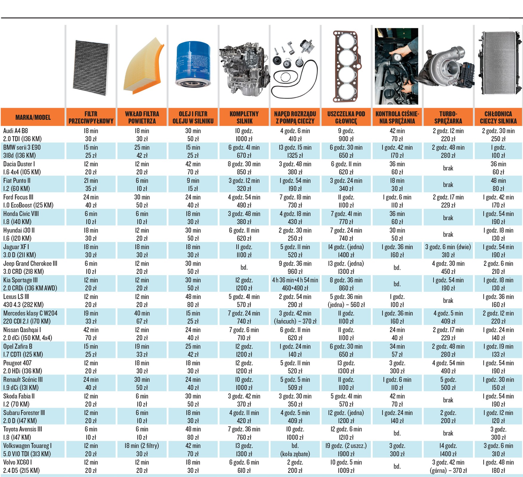 Warto też jasno zaznaczyć, że prezentowane czasy napraw czy stawki roboczogodzin nie są w żaden sposób wiążące dla warsztatu – nie ma on obowiązku nawet znać takich norm, a już na pewno nie musi się do nich stosować. Wiele czynności łatwo podważyć (chociażby argumentując, że tyle zajmą chyba w nowym aucie), posiłkując się doświadczeniem. Poza tym wyższe koszty często leżą w… interesie klientów. Weźmy pokazaną w tabeli Zafirę B z silnikiem 1.7 CDTI. W teorii operacja wymiany turbiny trwa w tym przypadku 2 godz. 48 min.