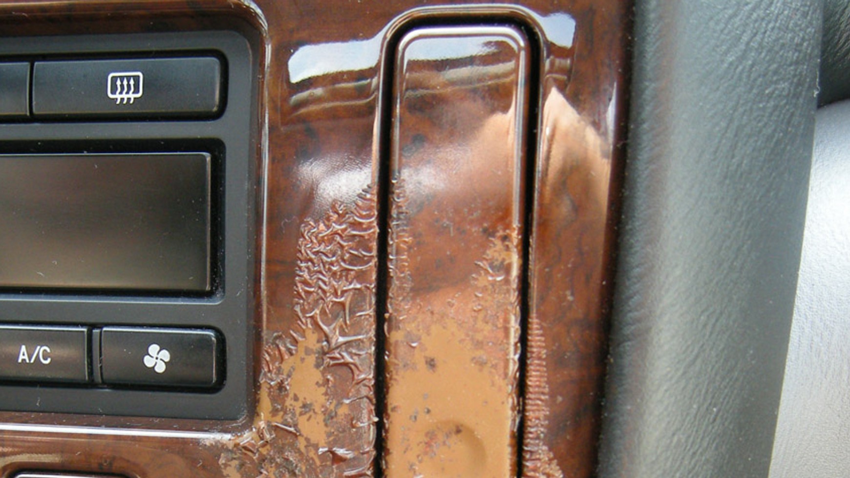 O drzewkach i dozownikach płynnych perfum do auta przypominamy też sobie zawsze, gdy któryś z naszych czytelników wyleje odrobinę takiego środka na deskę rozdzielczą lub położy w aucie niezabezpieczoną folią choinkę. Efekt jest zawsze podobny: w zależności od rodzaju tworzywa albo jego zewnętrzna warstwa spływa razem z kroplą perfum, albo pojawia się dziura, albo tworzywo puchnie, albo tylko zostaje na nim matowy, nieusuwalny ślad po reakcji chemicznej.